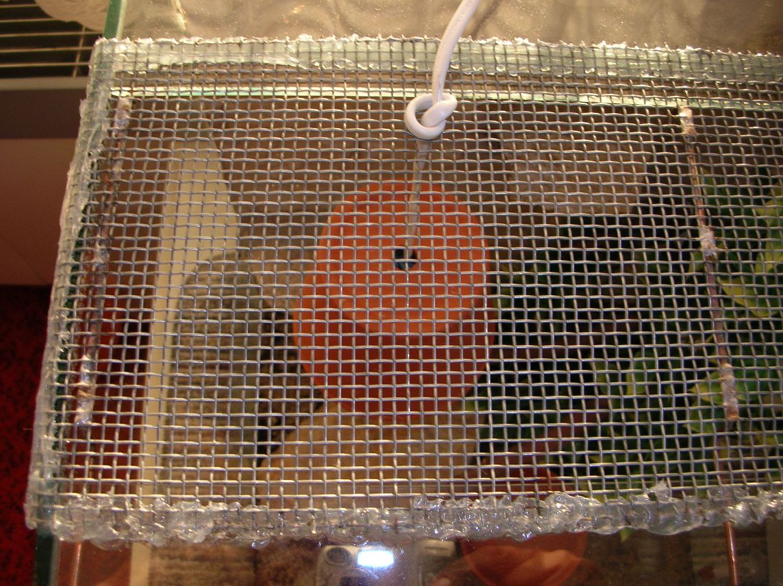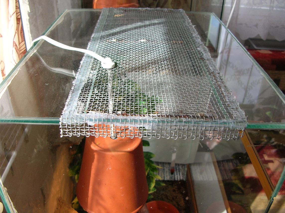 Takže ve stropě mám díru 40x13 cm, pletivo (oko 4 mm, používají to včelaři) je o trochu větší 43x15 cm a je položené zvenku. Původně bylo vyndávací, tak mám okraje začištěné pájkou. Tou pájkou mám zevnitř přidělaný ještě tři silnější zprohýbané dráty, které tu síťky držely u skla (neumím popsat, ale tak za hoďku až dvě nafotím). Kabel od žárovky tou síťkou taky prochází, před zapojením k objímce stačilo trochu zvětšit jednu díru. Žárovka visí poblíž skla, aby se síťka neprohýbala. Původně v tom byly ještěřky, takže to stačilo. Teď tam mám malého hada, takže jsem to celé napevno přilepila akvaristickým silikonem. Takže pokud nemusí být síťka vyndávací, tak jsou ty dráty uvnitř zbytečné. Vlastně by se to v případě lepení napevno nemuselo ani začišťovat, ale musí to být zvenku.