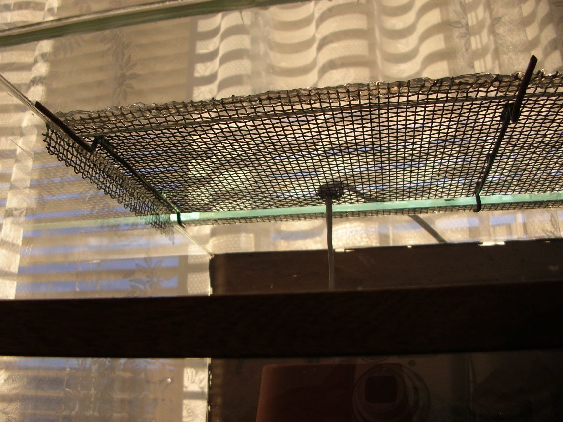 Terárko je ze skla (tloušťka skla 5 mm), ale to síto má drát tlustý cca 1 mm. Měl jsem představu to nějak orámovat a pak nechat jako samostatný díl stropu nebo spojit se sklem. Zároveň přes to ještě půjde světlo (kabel od objímky).