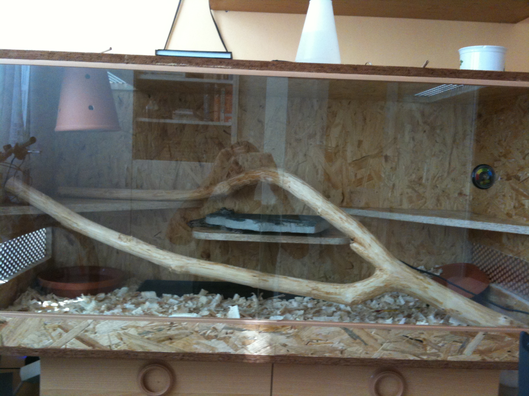 Poté jsem ho přesunul do terária z OSB desek o rozměrech 120x50x60(D-Š-V), viz. přiložené foto. Zde jsem ho krmil den po umístění dvěma skákavkama, které bez problémů přijal a asi po týdnu se vyprázdnil. Květináč, ve kterém je umístěna bodová žárovka 25W byl v tuto dobu umístěn níž, aby vyhřál dno terária, ale had si vylezl vždy na tento květináč, kde se obtočil a vyhříval se tam, bylo tam kolem 35 stupňů. V ostatních místech terária je větší chlad, kolem 25 stupňů přes den a v noci i kolem 22(podle teploty venku). Po asi 10 dnech dostal had další dvě skákavky, po kterých ale vůbec "nevystartoval", i když mu přišly skoro pod nos, hlavně jak je terárium velké, tak si tam myšky pobíhají jak se jim zachce. Takže jsem myšku chytl za ocas, dal jí hadovi před nos a po pár vteřinách po ní had skočil a zadusil jí, pak normálně spolkl, ale při tom mu zůstalo jedno semínko té kukuřičné drtě v puse, snažil se všemožně kroutit a dostat ho ven, moc mu to nešlo. Když jsem mu to chtěl vyndat, tak jsem se lekl víc já toho jak se lekl on mě a ucukl, tak jsem si řekl, že mu dám druhou myšku a tu spolkne s tím kouskem té drtě, což se i stalo, ale zase byl zájem hada o myš velmi malý, tak jsem mu jí musel dát před nos.