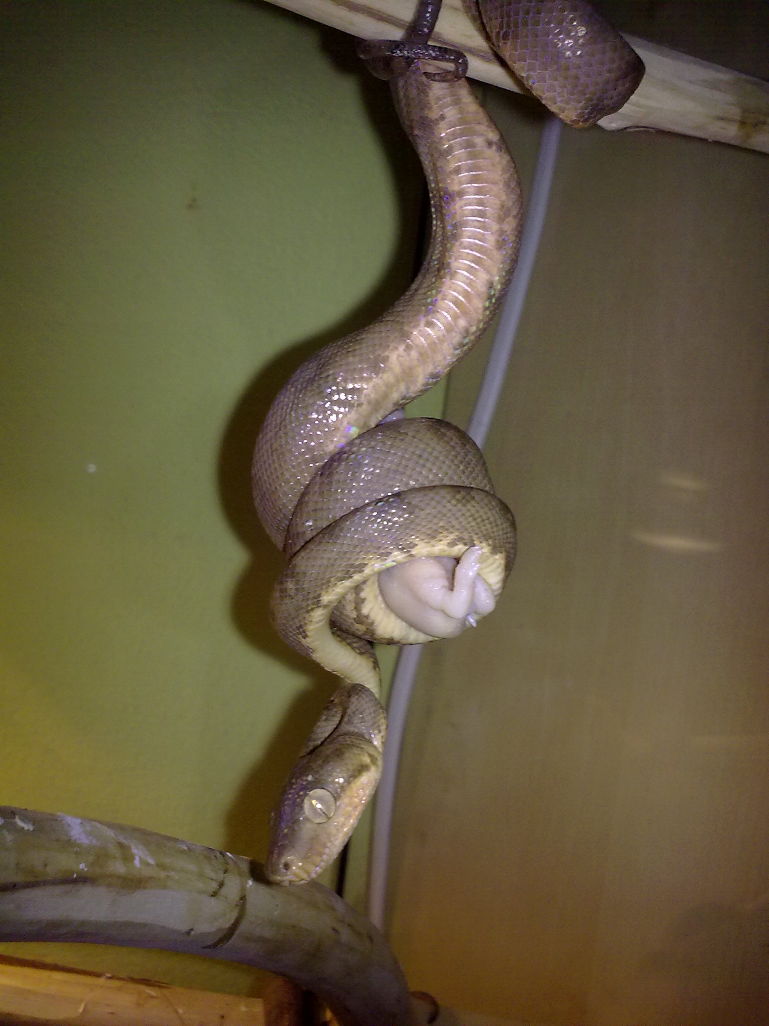 Morelia Viridis Jayapura, 8mesicni mlade: na prvni je potkani hole a na druhe je myska.