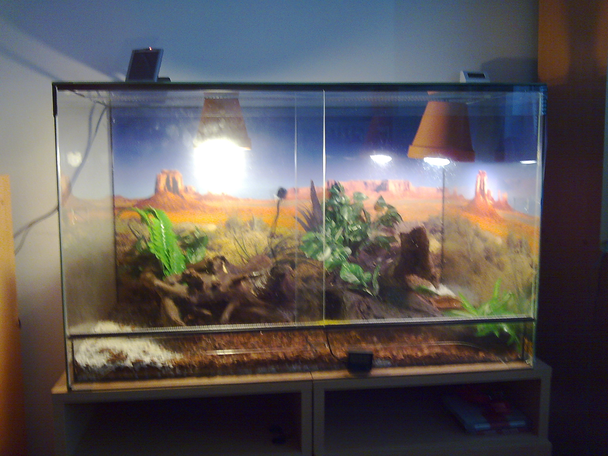 jeste doplnim, ze terarium neni ani pri nejmensim luxusni...uz to ze ten pritroublej UVB compakt je schopnej to UVB ze sebe vytlacit maximalne na 20cm a to jeste kdyz je nova...tim padem ti s klidem muzu rict ze pokud nevisi na te lampicce UVB nema...kdyz pominu ze se pro leguana hodi terarium situovane na vysku s MNOZSTVIM VETVI....