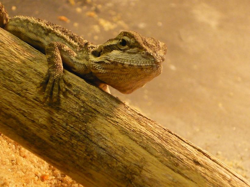 Jinak papá menší crvčky, ze zeleniny snědla zatím jen mrkev a kaká každý den, v terárku (60x40x40) máme žárovku UVB 10 a nahřívací žárovku sun glo 50W, pod ní břidlici, v prostoru dva klacky, základ je jemný písek z Pet centra a v jednom rohu kůra, kam se schovávaj cvrčci. Denně pije vodu z prstu nebo ji rosím. Teplota přes den je kolem 31°C na vzdáleném místa od nahřívacího světla, pod ním může být tak 38°C.