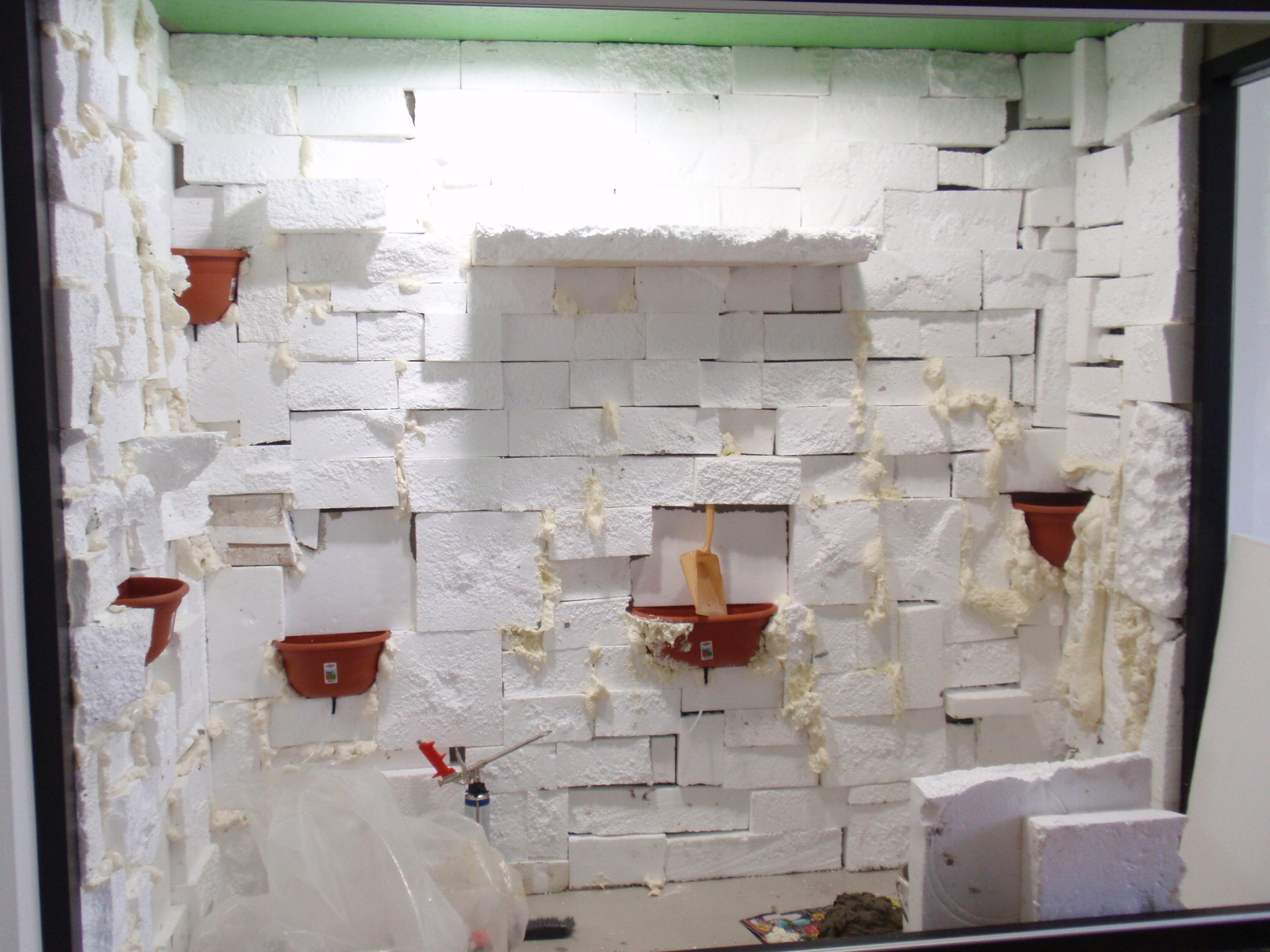 Já polystyren tvaruji tak,že ho vlepím do terária a pak horkovzdušnou pistolí vytvaruji prohlubně,terasy atd.Akorát musíš dát bacha,aby jsi nefoukal dlouho na jedno místo,ale to uvidíš,jak se Ti propadá polystyren.Tu terasu jsem udělal tak,že jsem na desku přilepil ještě hrubý tvar terasy a pak teprve jsem ji tvaroval horkovzdušnou pistolí.Potřel lepidlem a popískoval.