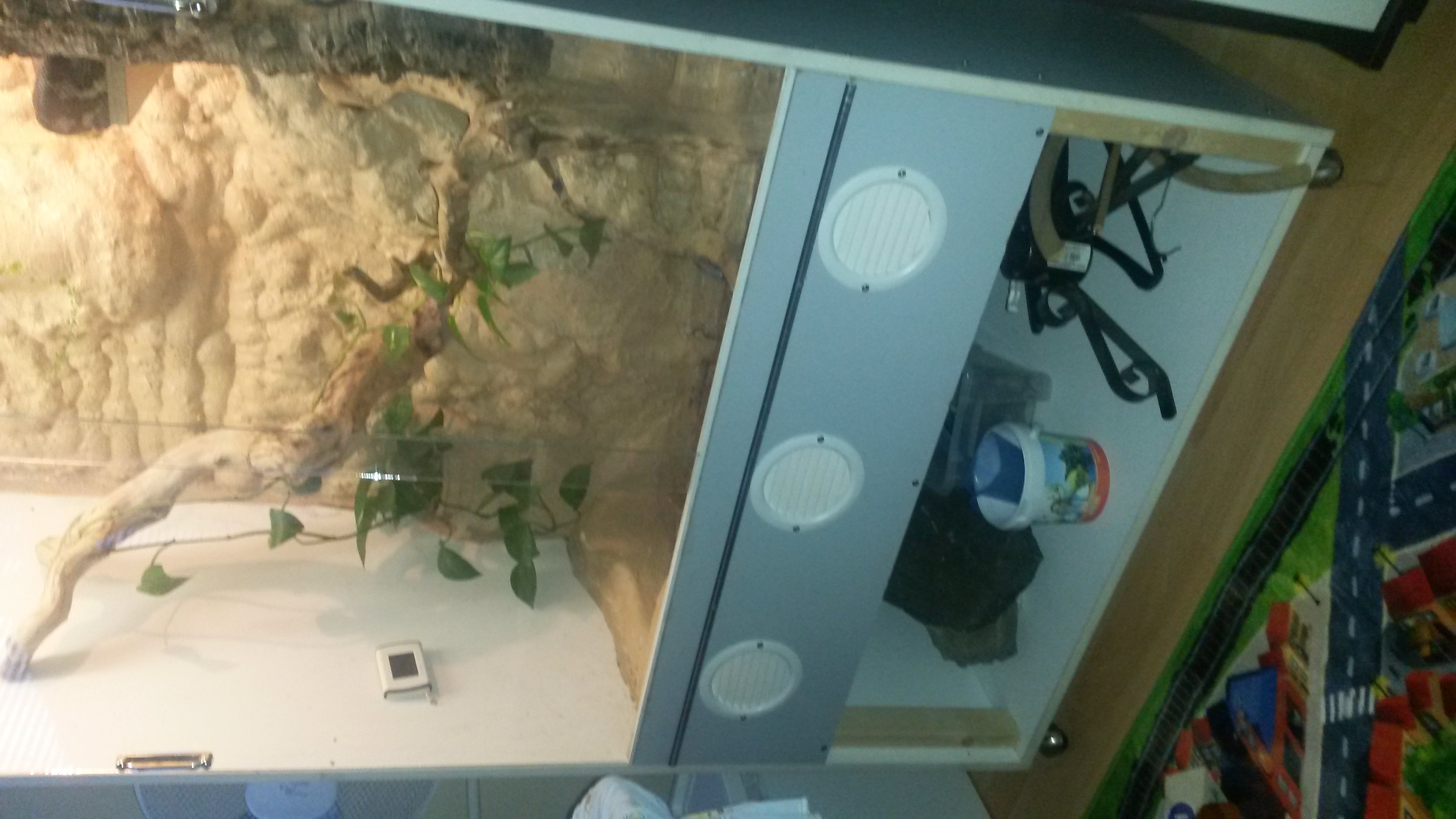 Já mám jedno terárium položené na mnou vyrobeném stolku a druhé je přes metr vysoké z bývalé skříně a na to jsem ze spodu přidělal kolečka. Foto přikládám