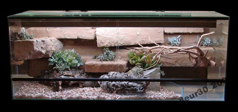 Terárium má rozměry 110x44x44cm, vestavěnou nádržku na vodu, velmi plastické pozadí, živý sukulent - sukulent na levé straně terária není - uvadl!!!!, kameny, korkové úkryty, UV zářivka 30W a vestavěné infračervené osvětlení v pozadí pro ohřev, jako substrát použity bukové štěpky, kořen. Zářivka s vlastním vypínačem a osvětlení v pozadí s vypínačem mimo terárium.