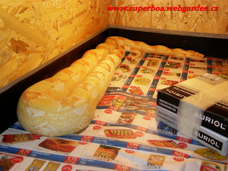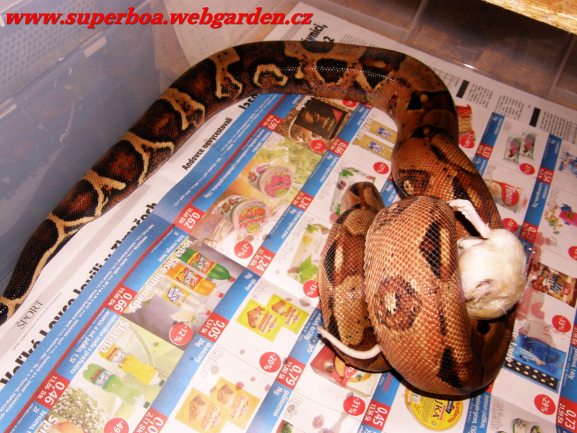Filip hmm fajné kúsky ;-) hlavne ten DH sunglow, u nás dostala dalšia samica ovuláciu takže už máme 2 pravdepodobné ,,tehule" Bolo to párenie Hog island boa + red salmon, párenie sme nezpozorovali, ale samica viditelne pribrala v zadnej časti tela a to nežrala 14 dní //tu špinu na podlahe si nevšímajte bolo to vyčistené hned ako sa presunula na poličku :-D// [http://tera.poradna.net/file/view/5160-ovulacia-30 -1-2010-jpg] Tu je samec red salmon [http://tera.poradna.net/file/view/5161-p1151799-jp g]