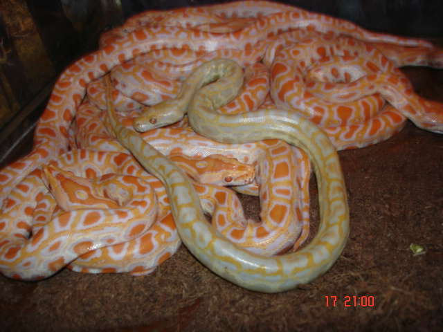 No vona ta "salmonice" je 50% super salmon a 50% het.albino red pastel + ještě poss. jungl ... Nejlepší by k ní byl samec albino na ověření co v ní vlastně je ... Ale ten bohužel bude až za dost dlouho nejspíš ... Šak ono se uvidí ... Tak bych teoreticky měl na výběr ze dvou samců (DH a ten jungl) ...Jungl by byl lepší ,ale otázka jestli se mu bude chtít žee ...:-) Proto jsem vypsal oba dva ...