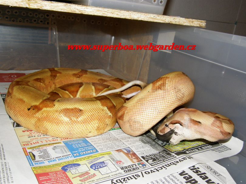 Filip hmm fajné kúsky ;-) hlavne ten DH sunglow, u nás dostala dalšia samica ovuláciu takže už máme 2 pravdepodobné ,,tehule" Bolo to párenie Hog island boa + red salmon, párenie sme nezpozorovali, ale samica viditelne pribrala v zadnej časti tela a to nežrala 14 dní //tu špinu na podlahe si nevšímajte bolo to vyčistené hned ako sa presunula na poličku :-D// [http://tera.poradna.net/file/view/5160-ovulacia-30 -1-2010-jpg] Tu je samec red salmon [http://tera.poradna.net/file/view/5161-p1151799-jp g]