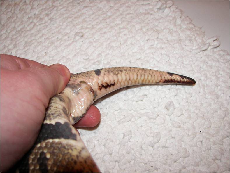 Proto jsme problém konzultovali s veterinářem - diagnoza: plísňové onemocnění (candida albigans). Nyní léčíme vakcínama od Mvdr. Vopršálka. Současný stav - had je "téměř" v pořádku, ale léčba bude ještě nějakou dobu pokračovat.