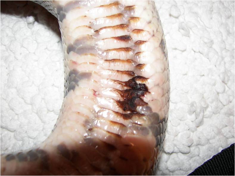 Léčba: dali jsme jí na noviny do sucha, lehce vlhčili akorát před svlekem, který následoval 2x rychlë za sebou. 1x denně jsme hada koupali několik minut v naředěné Betadině. Po svleku to téměř zmizelo, ale po dvouch týdnech se to zase pomalu vracelo ikdyž byl had v suchu.