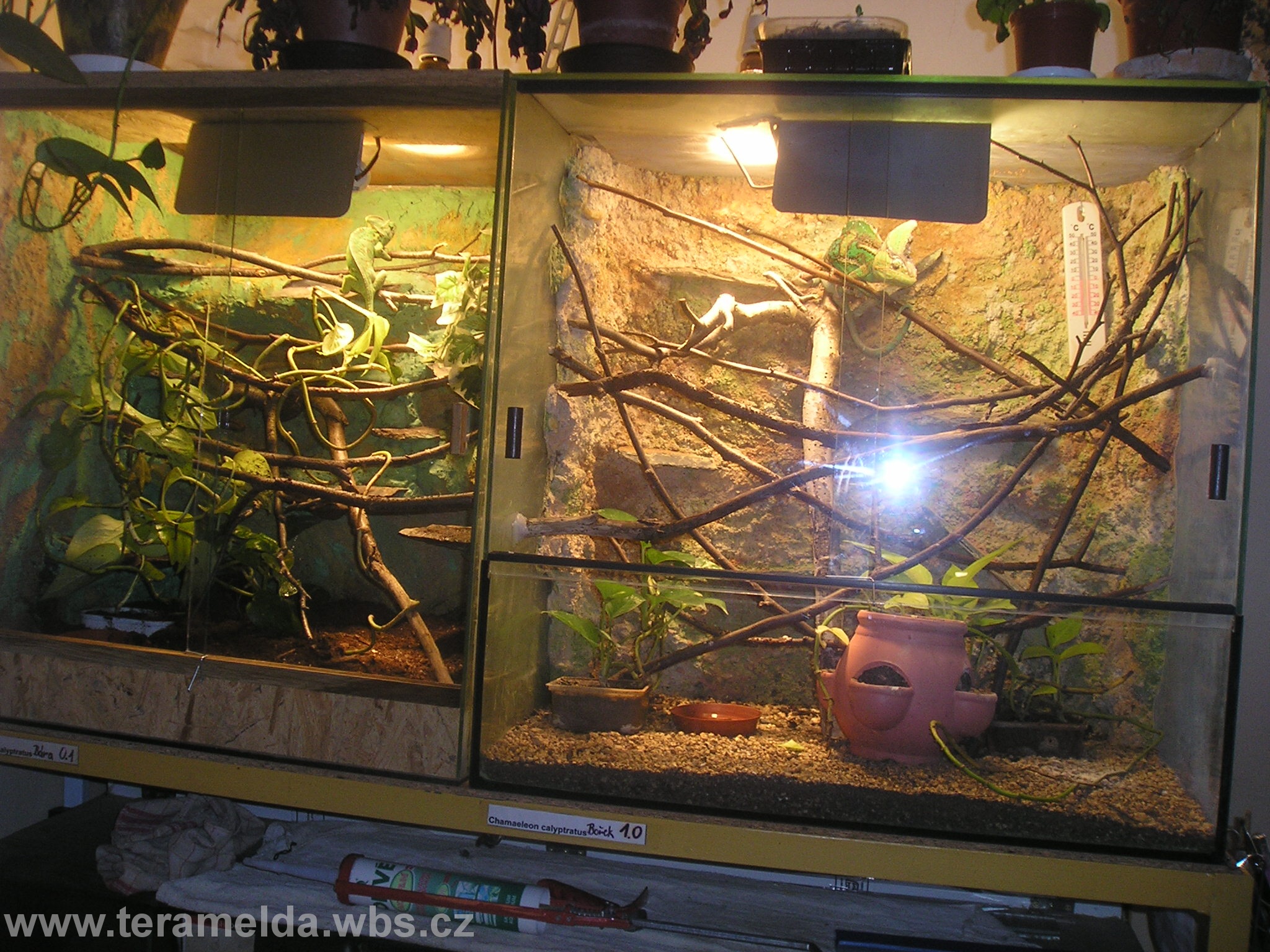 Já sem včera předělat světla u chameleonů a místo bodovek 60w,které byli uvnitř terária jsem tam dal 80w Flood..Žárovky jsem zavěsil nad terárium.Chameleoni se vybarvili víc dozelena a terárium se lépe prosvětlilo.Jesli je ta žárovka lepší než obyčejná,to musí říct Mike,já jsem na tohle mimon.:-)