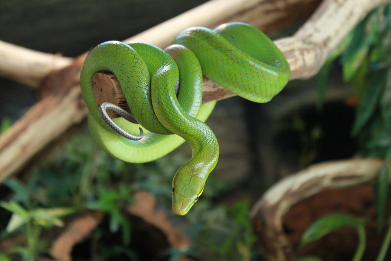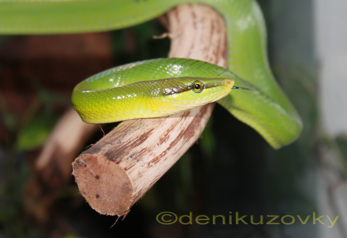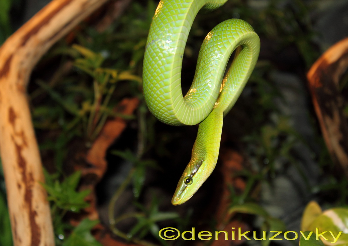 Gonyosoma oxycephala , samice , z odchovu 9/2011 , pořízená ve stáří 2 měsíce , byla umístěna do terária 50x60x100/dxhxv/ s množstvím umělých i živých květin a úkrytů v jeho horní části .