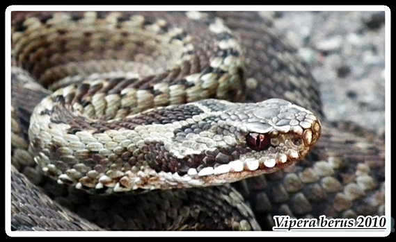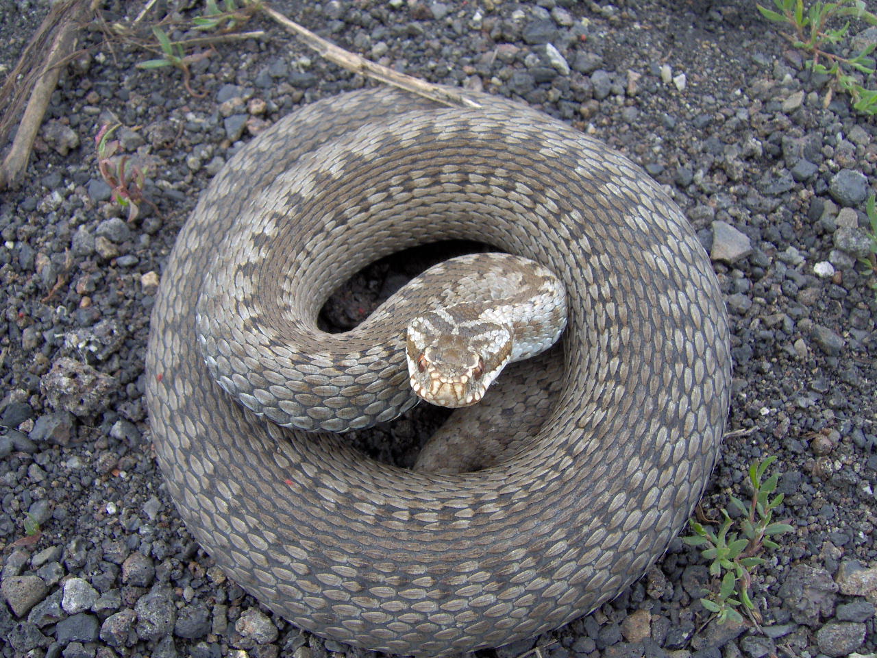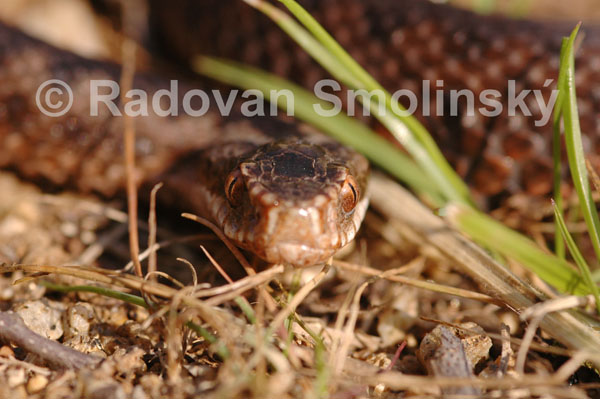 Vipera berus - zmije obecná (zornice, tvar hlavy, bílé retní štítky, "krátké a robustní" tělo atd., to je příklad znaků)