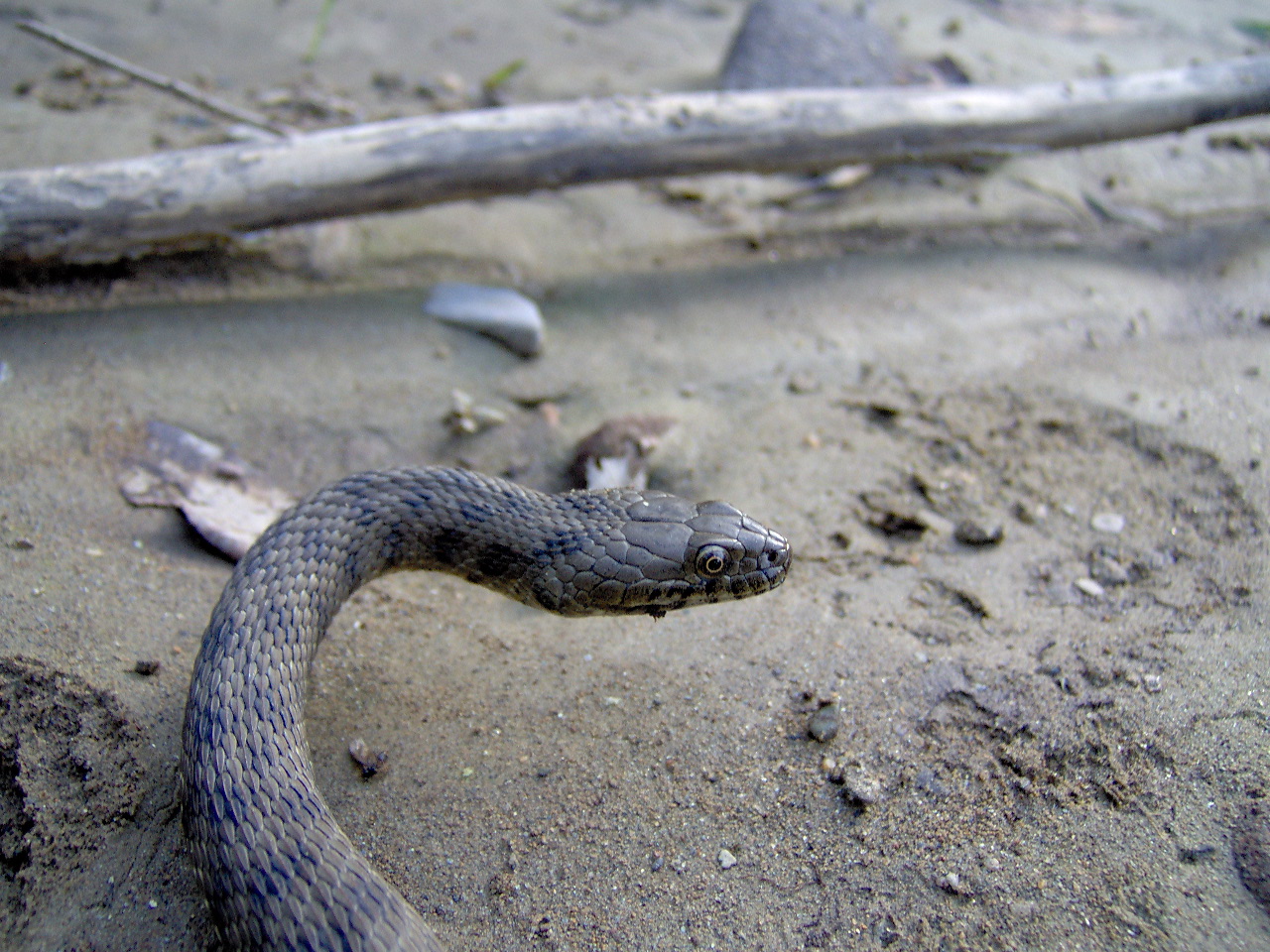 4. 7. 2010 - Natrix tessellata, Praha - Troja, jedna tessellata, kterou jsem však nedohonil, byla přímo obří, ty na fotkách nejsou rozhodně malý, ale proti tý, co jsem tam tentokrát viděl, malý jsou
