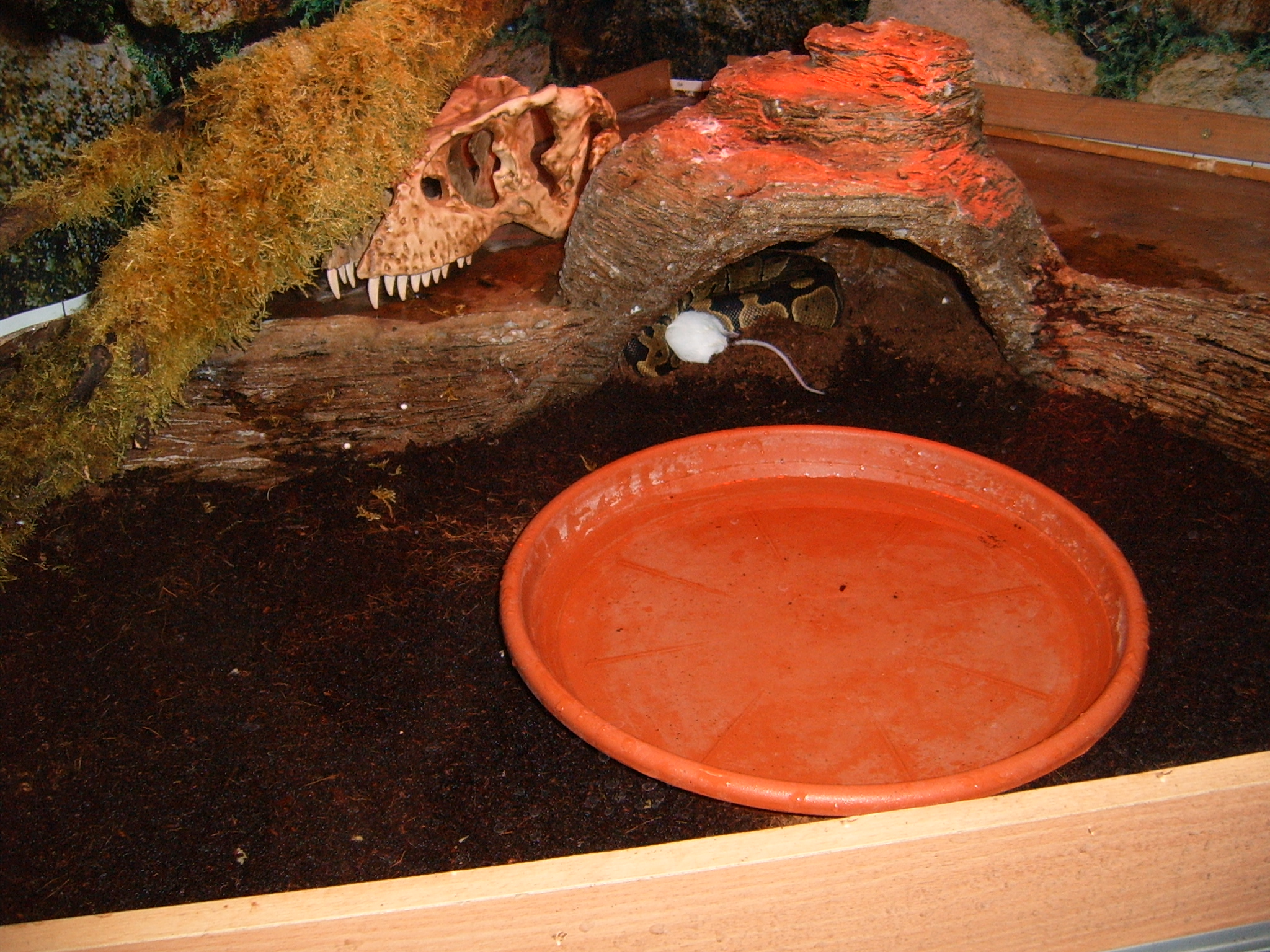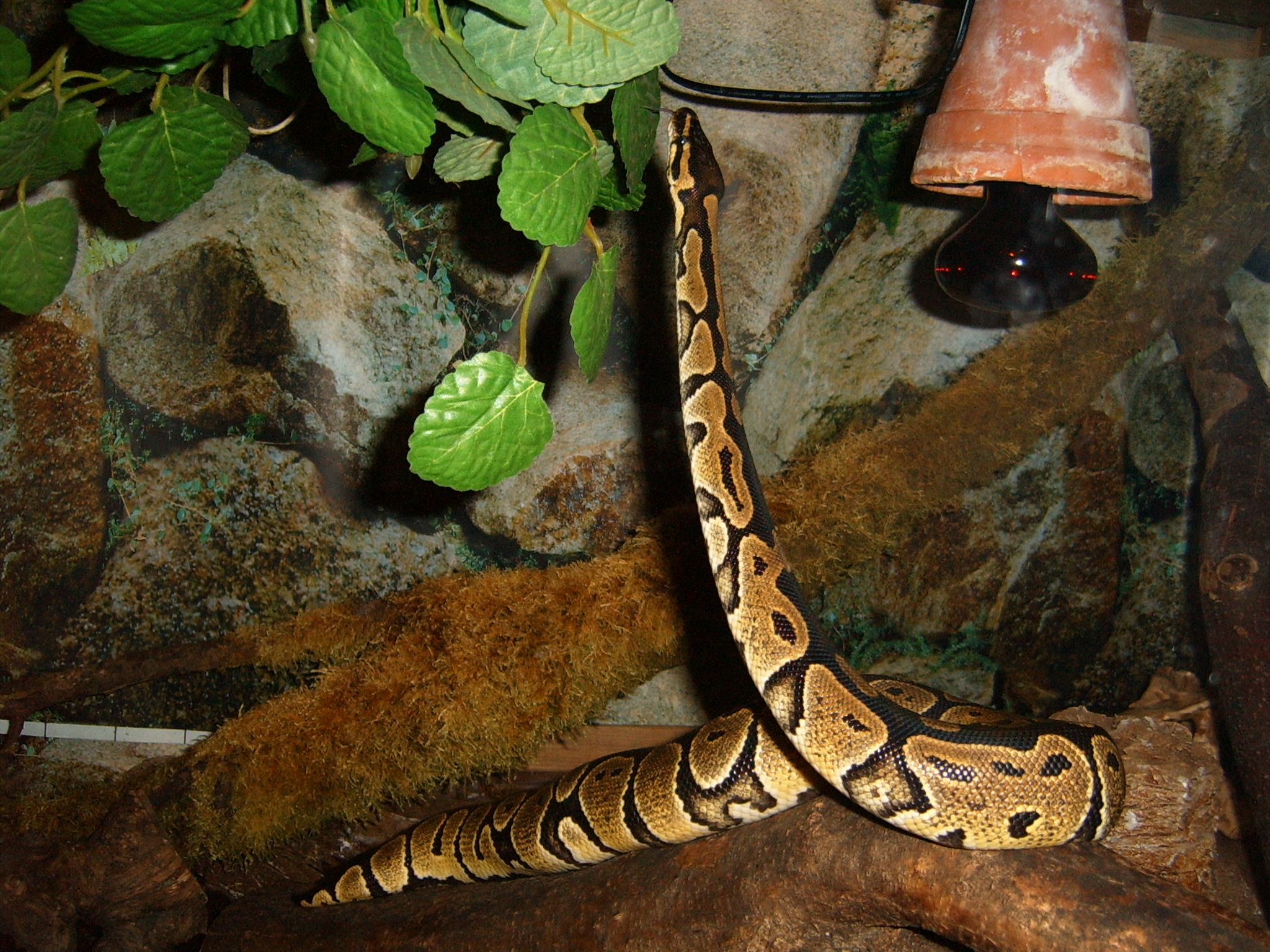 minulý štvrtok som od kamaráta kúpil Pytóna kráľovského, má necelý meter a je skoro rok starý (kúpil ho v marci minulého roku). Používame substrát lignocel. Vlhkosť v teráriu je cez deň keď mu svieti výhrevná lampa tak 50% až 60%, teplota 26-30 stupňov. V noci sa vlhkosť vyšplhá aj na tých 80% a teplota mierne nad 20 stupňov. Terárium je rohové 120x120, výška 80cm, čo je pre neho dosť veľké terárium.