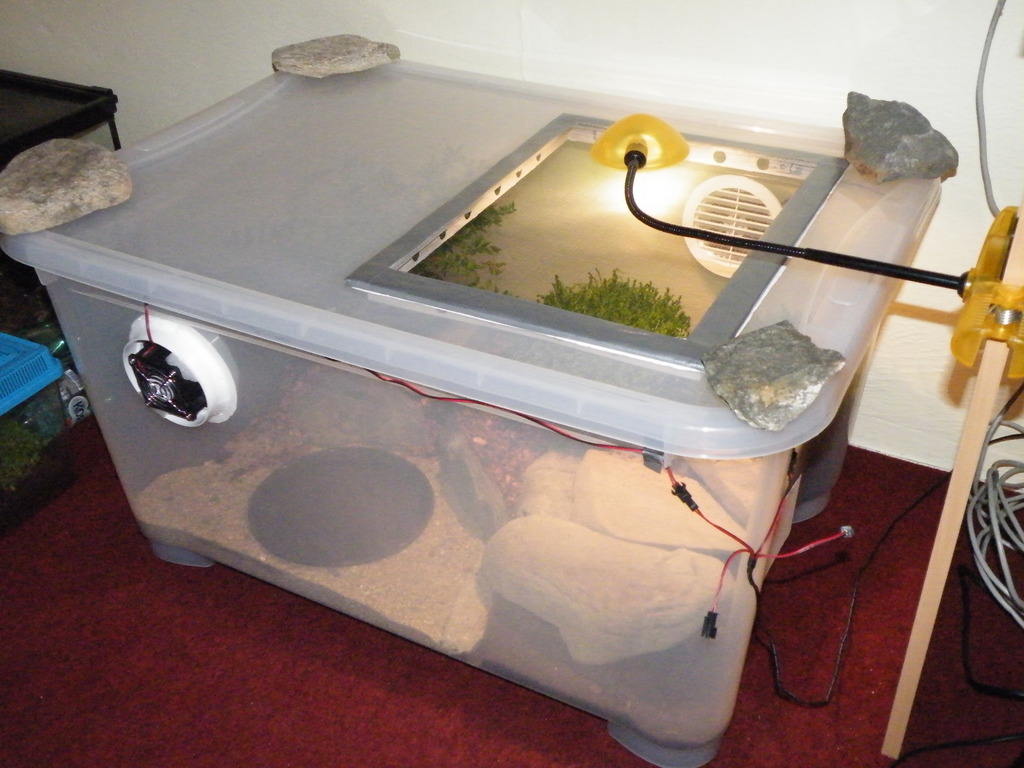 Vetrak je to s docela nizkyma otackama a termoregulaci, puvodem z PC neni. Ma to byt takove preventivni opatreni proti plisni v zadni casti teraria, kde je miska s vodou. Fouka smerem nahoru na spodni stranu vika, kde v lete obcas kondenzuje voda. Had (L.g.californiae) v tom zije od minuleho jara a zatim nemel zadne problemy. Je ale pravda, ze lepsi by bylo udelat jeste druhy otvor se sitkou. Tento rok budu delat nove, tak se to pokusim vyresit lip.