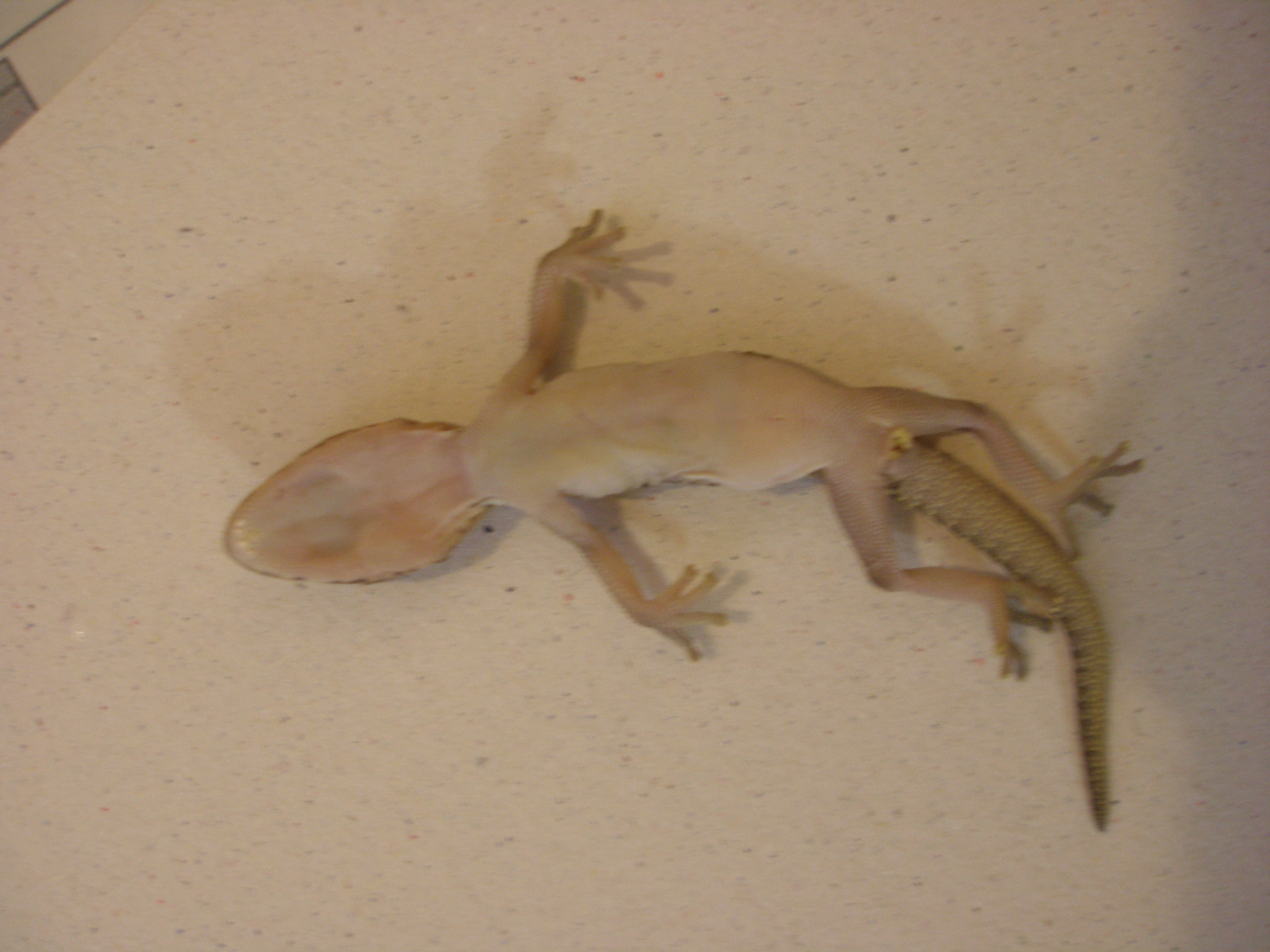 Dobrý den, po nějakém roku chování chameleona jemeňáka jsem se rozhodl pořídit si další zvířátko - Paroedura pictus měsíc starý (pravděpodobně)pár - pohlaví se určuje v tak mladém věku velmi těžko.. Vše vypadalo v pohodě...gekoni byl svěží bez jakýchkoliv příznaků, běhali po terárku, zřali cvrkáče obalené ve směsi Roboranu H a plastinu. Bohužel dnes, po týdnu v mém "zajetí" došlu k úhynu jednoho z nich. Ráno ještě prozkoumával terárko a najednou ex. Chovám je v terárku 50x35x30 cm (dxšxv) Jako podklad použitý kalciový písek vita-sand a v rohu terária lignocel který jsem rosil(připravené pro plánované snůšky). miska s vodou měněna každý den, krmení též každý den vypuštěním 10ti ovitamínovaných cvrků do terárka tak velikosti jejich hlavy. Vytápěno Halogenem 30W (teplota v terárku 32 pod zdrojem, 26 nechladnější místo)...v noci teploty kolem 20ti. přikládám foto terárka. Nevim proč tak z nenadání jeden z nich zemřel...druhej je bez nálady, leží na jednom místě, ještě jsem ho dnes neviděl zřát ani pít. Nechá se převrátit bez problémů na záda... "syndrom hadrové panenky" bojim se že přijdu i o něj. Nevím co dělat, co je špatně? Mrtvý gekon, i ten zatím živý mají pravděpodobně nafouklé břicho - aspoň mi to tak přijde - viz. foto. Žádné změny ve stravování, přesun terárka nic z toho jsem nedělal...proč jsem přišel o mojí paroeduru..prosím o radu