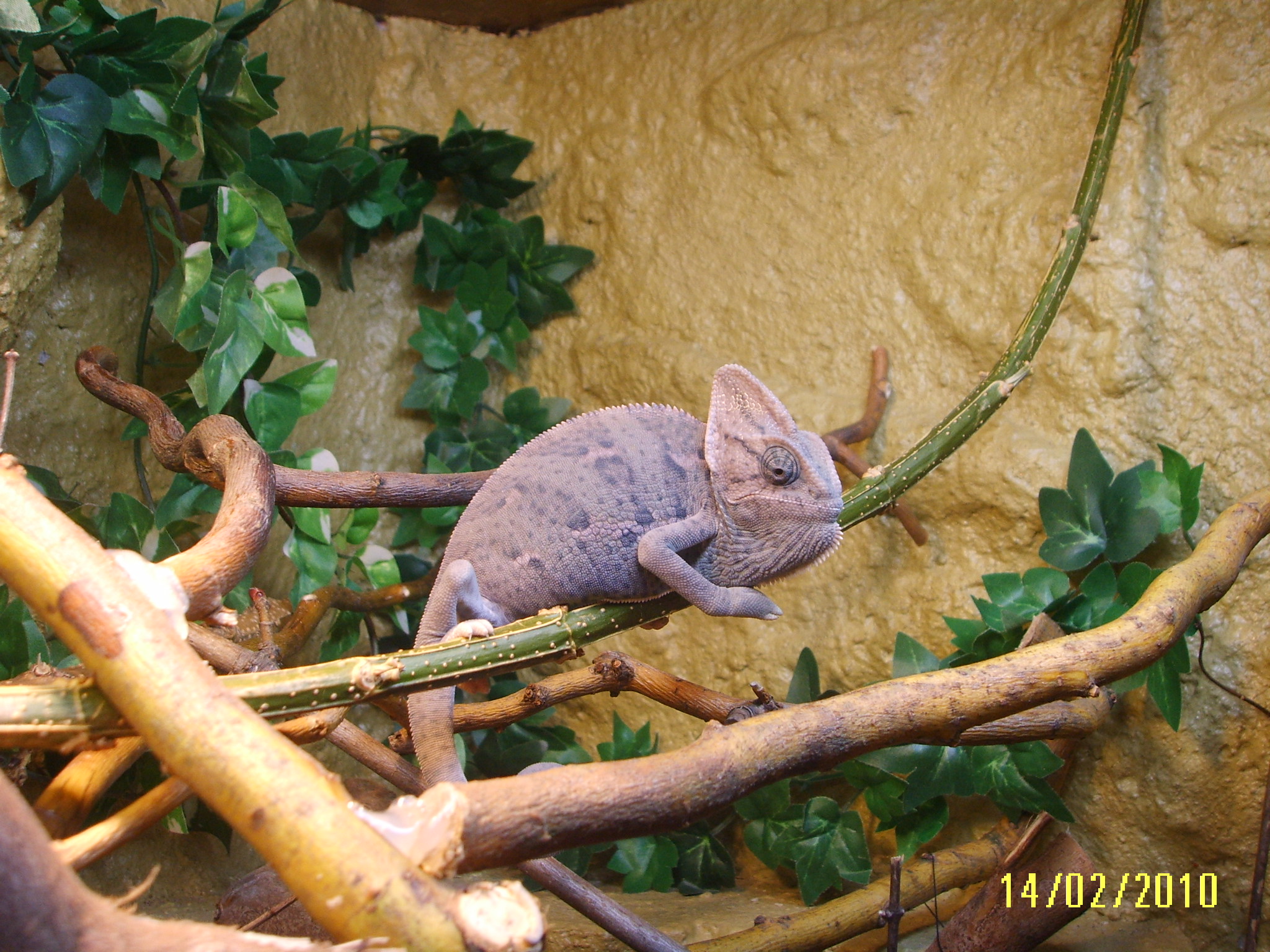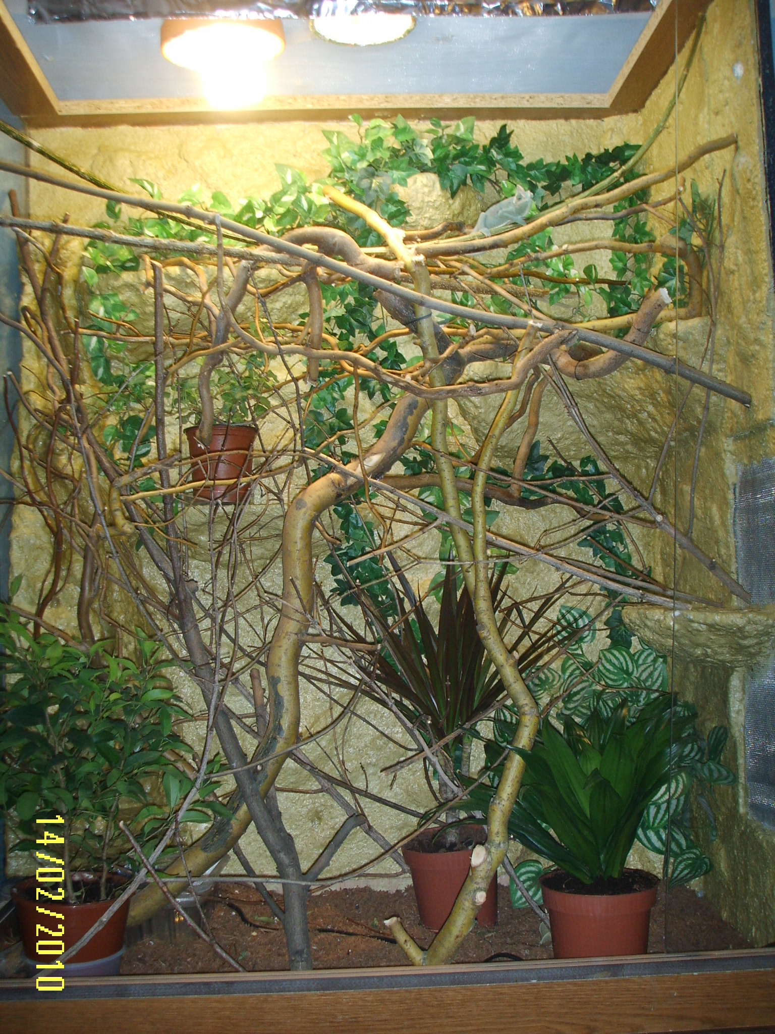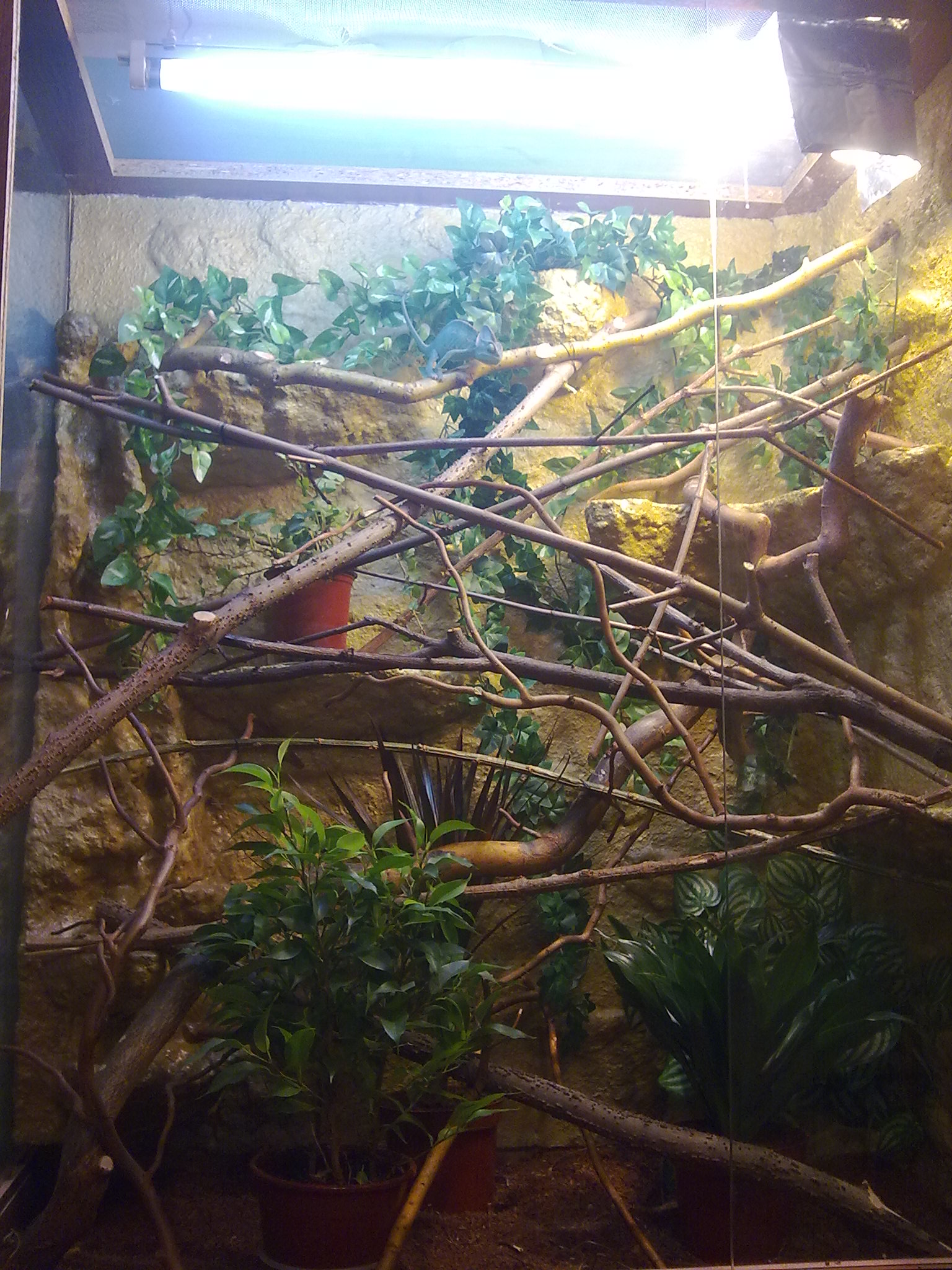 Možná se bude svlékat.Každopádně si myslím,že je to terárko strašně divoké.Ty větve jsou taková neproniknutelné houština.Volil bych větve terasovitě odskákat,aby tvořili takový žebřík.Zářivku bych dal blíž k chameleonovi.Je jasné,že víc světla znamená hezčí barvu.