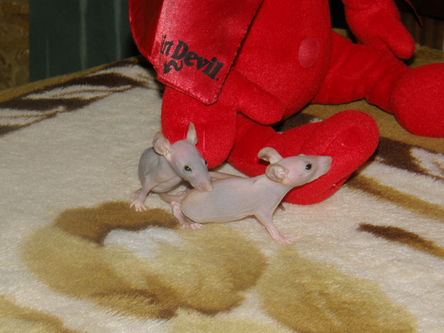 Len je problém v tom že tieto potkany sú podstatne drahšie ako klasika mi predávame čistých sphynx 10-12€ a fuzz 6€. Aj sa tažšie chovajú, majú viacej zdravotných problémov hlavne s očami lebo nemajú žiadne mihalnice. Nemožu sa chovat na hoblinách, ale napríklad na novinovom skartovanom papieri. Teplota musí byt viššia ako u normálne osrstených, minimálne 16 stupnov lebo velmi lahko prechladnú.