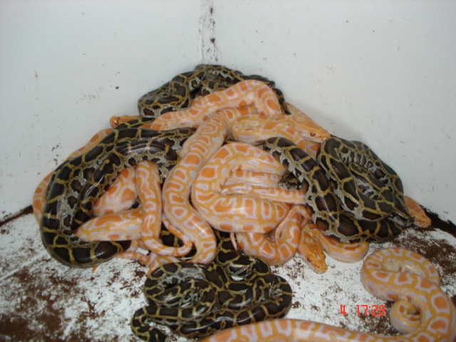 Teraz k tomu umelému oplodneniu išlo o kamarátovu samicu P.m.b.albino.Dal som jej tam samca albína on sa aj snažil o odpárenie ale jej ako keby to vadilo stále ho zhadzovala a miestami mi to pripomínalo ako súboj dvoch samcov a po takej polhodine ho to prestálo baviť.Nahal som ho tam 3dni ale žiadnu aktivitu som nepozoroval.Tak som to skúsil o týždeň a scenár sa opakoval.Našťastie samec green mi páril samicu green a ako ju dopáril keď jej nadvihol chvost a držal zatlačenú kloaku tak som si všimol že samica má pod kloakov kus vytečených spermii.Tak ma hneď napadlo skúsiť s tými spermiami oplodniť tú albínu.Natiahol som tie spermie do pipety a jednoducho som jej to vstrekol do kloaky.Ani neviem ako a vyšlo to.Pozrel som sa do zošita kde si robím záznami tak to bolo v roku 2005 a výsledok bol takýto:34ks vajec z toho 1neoplodnené a vyliahlo sa 19 albínov a 14 tmaviek.Takže tie tmavky sú naisto z toho umelého oplodnenia a tie albíny neviem mohol ju odpáriť aj ten albín niekedy v noci keď som to nevidel alebo sú tiež od toho greena lebo čo som v ten rok zistil keď sa mi po tom páre greenov vyliahla 1/4 albinogreen že sú to heterá na albinogreen.Od vtedy s tou albínov nie je problém k páreniu dochádza do 1 hodiny.