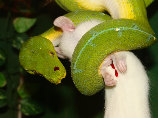 Je mnohem lepší zkrmit mladého potkana, než starou zatloustlou myš (hodně velký poměr tuku, nekvalitní svalovina - proto se porážejí jateční zvířata co nejdříve). Krmit adult viridky mladýma myšma je úplná hovadina, natož ještě krmit krajty, byť stromové, 1x za týden.