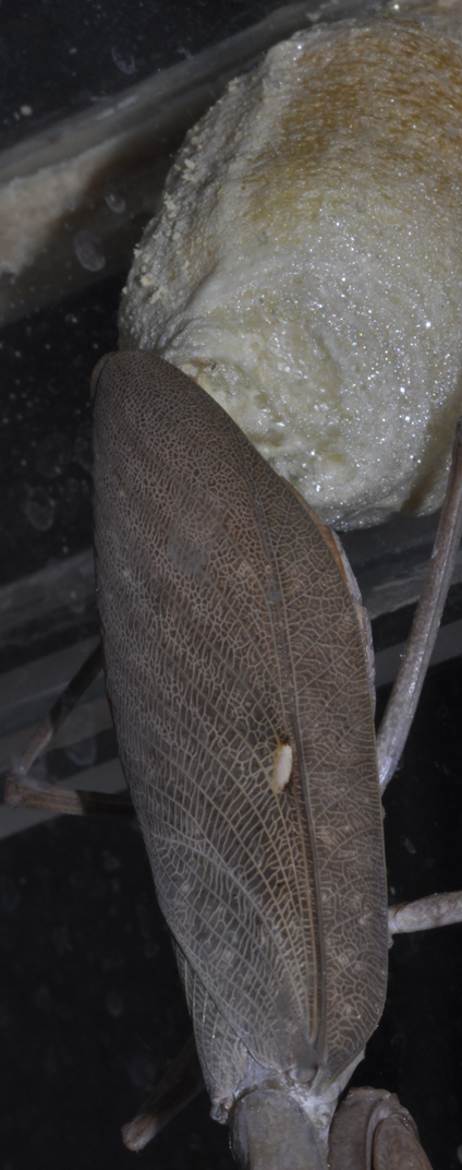 Na prvním obrázku je samička rodu Sphodromantis vytvářející ootéku.