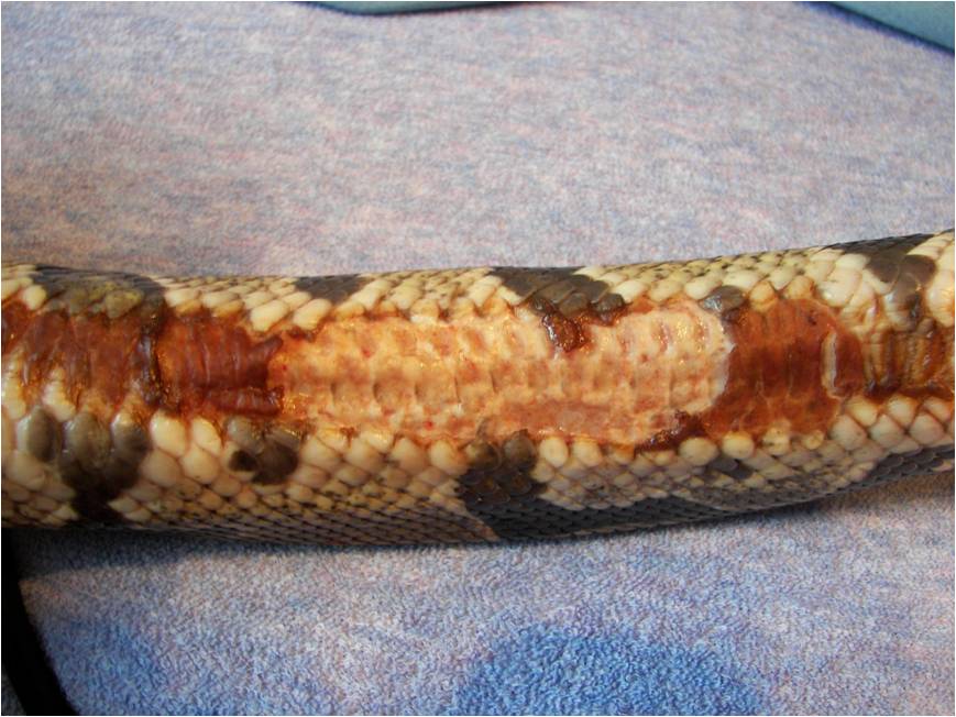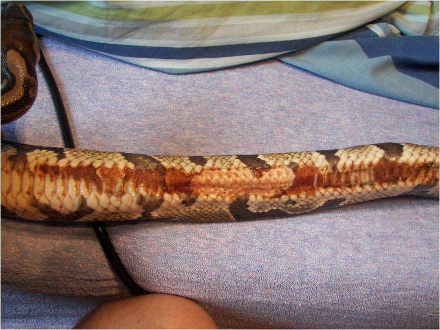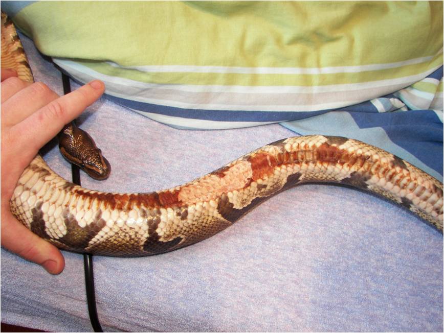 V současnosti již nevím jak krajtě pomoci, navštívil sem i veterináře, který mi poradil koupele v hypermanganu, heřmánku (před svlekem) a popřípadě desinfikovat pomocí roztoku betadinu. Dělal mi několik testů na přítomnost plísní atd… jediné co se zjistilo (mikrobiologický rozbor) bylo, že se jedná o nějaký druh infekce se kterým by se had za normálních okolností měl vypořádat tímto postupem, ale bohužel u mého jedince tomu tak není. Byly nasazeny i antibiotika Marbocyl, které sem aplikoval 1x denně po dobu 14ti dní. Doktor říkal, že by mohl aplikovat i silnější antibiotika, ale že se mu do toho nechce, jelikož jsou pro hady toxické. Jen bych ještě dodal, že had naposledy přijmul potravu 17.11. 2009 od té doby nejeví zájem.
