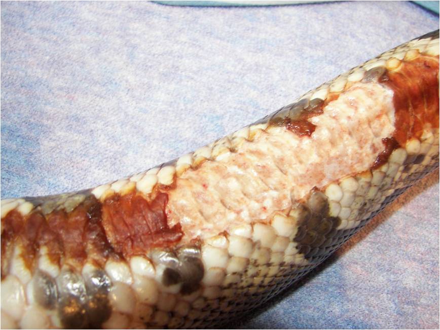 Mám velký problém a byl bych moc rád, kdyby jste mi svými zkušenostmi a názory pomohli se záchranou mé krajty. Začalo to takto viz odkaz tera.poradna.net Problém je v tom, že vždy po svleku se zasažená místa během několika dní opět podchytí touto asi ,infekcí´ (po samotném svleku je kůže krásně čistá a nejeví známky nějakého poškození). Největším problémem je postižená část (viz foto), na které se vytvořil jakoby strup, po jeho odmočení a sundání má krajta toto místo stále bez šupin a vypadá to jakoby to měla až do masa (ale rána je suchá – nemokvá).