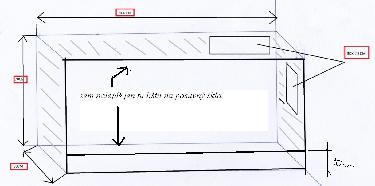 prosím o radu terária z OSB desek potřebuju vyřešit přední stranu, asi bych pvná požil posuvná skla prazny je moznost pro dokresleni jak by jste to resili vy, a moznost 1 je z 10ti cm okraji z každé strany, děkuju za každou radu i připomínku, a omlouvám se za ten obrázek