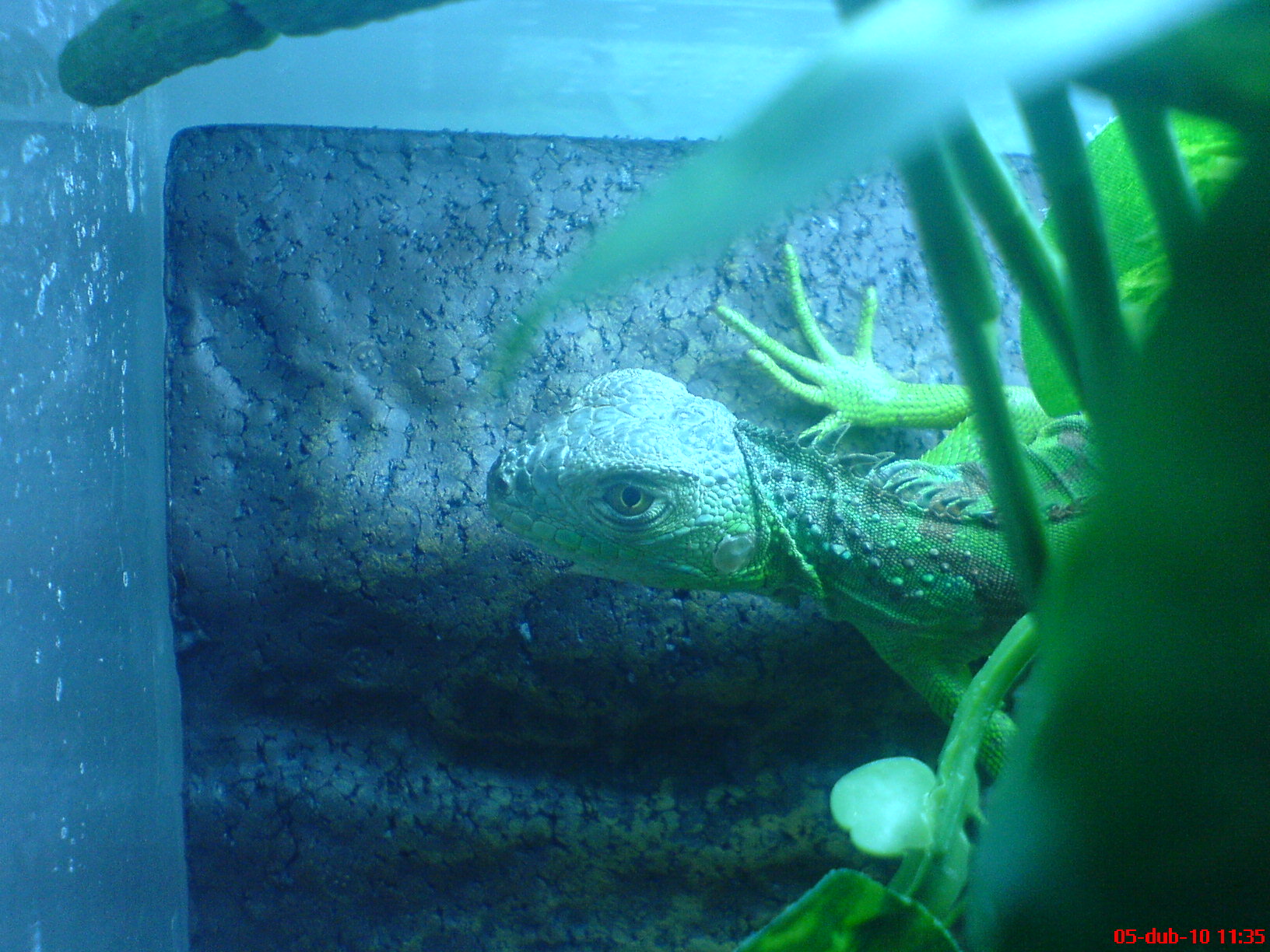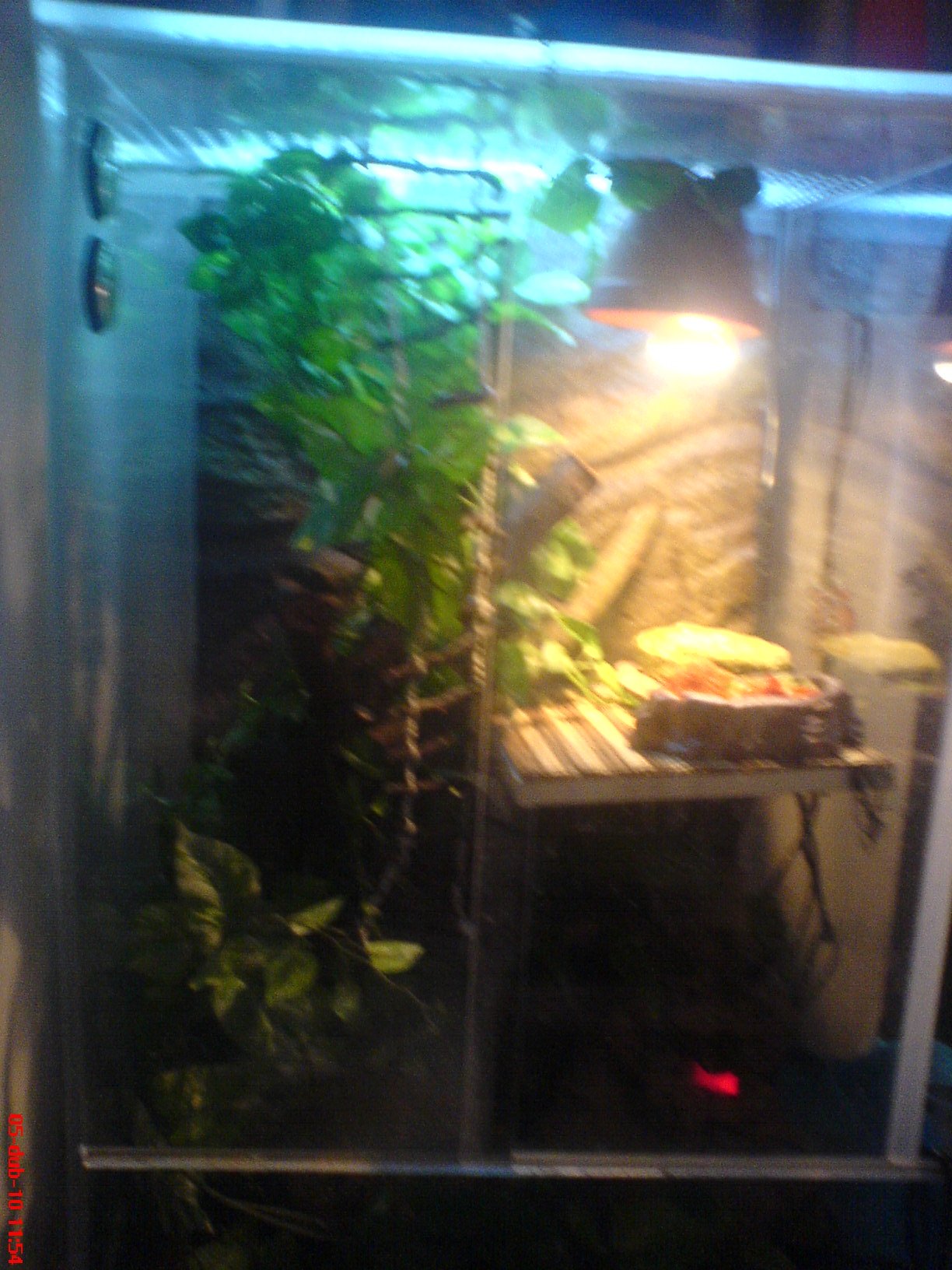 Jinak vybavení terária... zatím má menší o rozměrech 120cm vysoké, 80 široké a 80 hluboké, má tak větve a umělé květiny, polici pod výhřevnou žárovkou dole podestálku lignocel a živé kytky - na zem moc neleze, takže ta podestýlka mi spíš pomáhá udržet živé kytky při životě, dále je dole na zemi fontána s mlhovačem - vytváří mi optimální podmínky vlhkosti. Nahoře nad teráriem je UVB trubice pod kterou je Sebastiánek stále natažený..na zadní stěne terária je klasické pozadí z polystyrénu.