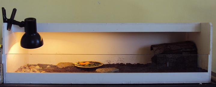 Jen bych si dovolil konstatovat, že žádné terárko po hadovi není "vhodné" pro suchozemky rodu Testudo (koneckonců je to diskutabilní i u jiných). Ubikace pro tyto želvy mají být s dobrou obměnou vzduchu, proto jsou v oblibě čím dál víc tzv. želví stoly, praktická jsou nižší akvaria, bez krytí stropu.