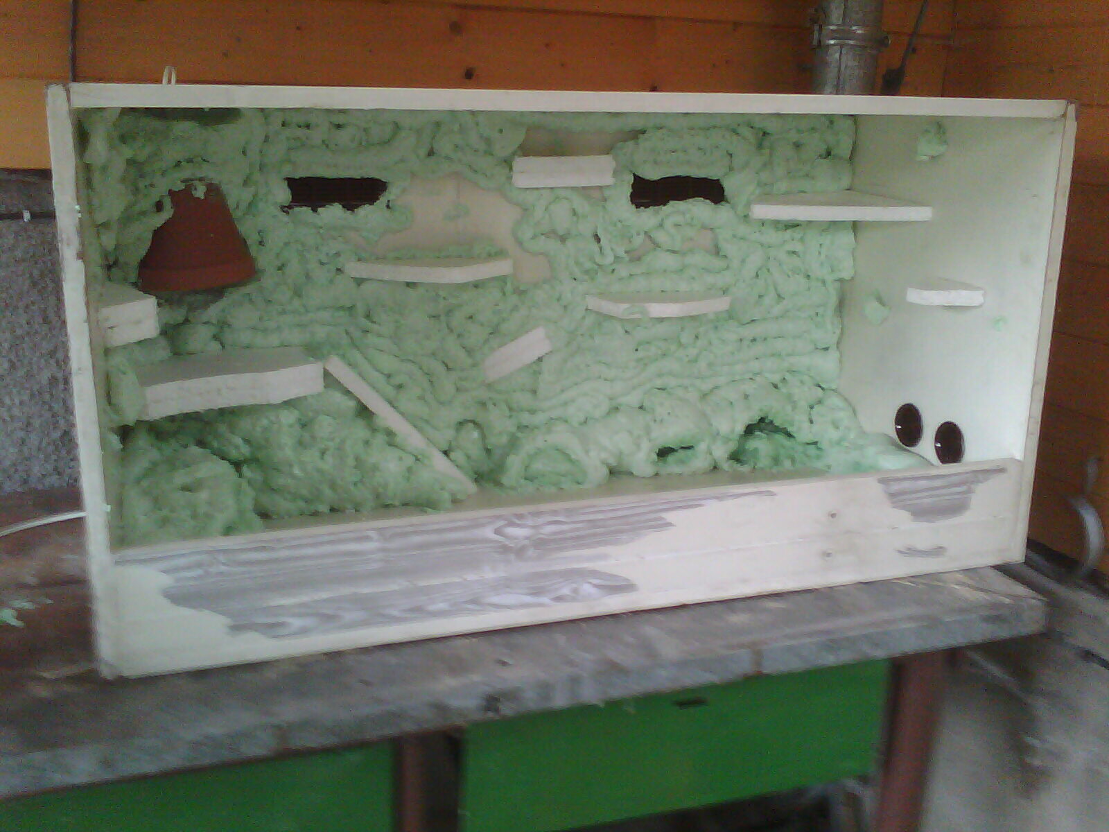 Při žárovce 40W je na květináči 52°C, při 25W - 45°C (měřeno v teráriu s teplotou vzduchu 28°C), takže bych se nabál vyhoření, ale dlouhodobé působení takové teploty na pěnu způsobí změnu její struktury tak že se začne drolit a rozpadat, tohle bych určitě změnil dokud je čas, za půl roku to bude stejně nutné předělat.