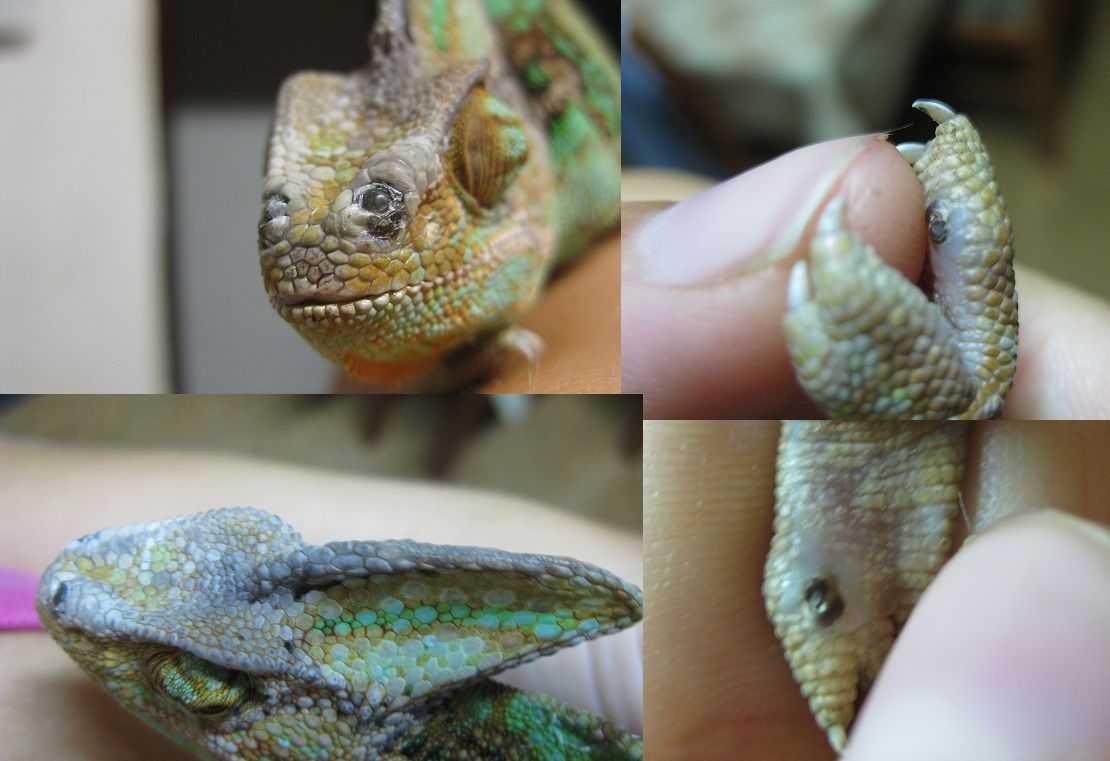 To co je na noze jsem už viděl a chameleon si s tím poradil sám jen mu celkem dlouho trvalo než to odrostlo a překrylo se plnohodnotnýma šupinama (2 měsíce). Důležité je udržovat čistotu a menší vlhkost, bo jak se do suché tkáně znovu pustí vlhkost a infekce tak je to zas naprd.