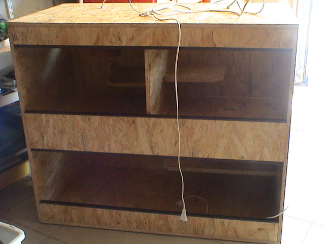 Nechci ti to nějak moc kritizovat, ale to větrání je dost malý, a ty zauzlovaný dráty, vyvedený vrchem jsou příšerný a hlavně nepraktický.Když bude chtít ta holka na to postavit v budoucnu třeba ještě jedno terko, tak už jí tam ty dráty budou dělat problém. Osobně bych udělal díru ze zadu a dovnitř dal nějakou lištu. A na kablík samozřejmě průchodku. Kdybych to teda dělal na kšeft jako ty a ne pro sebe