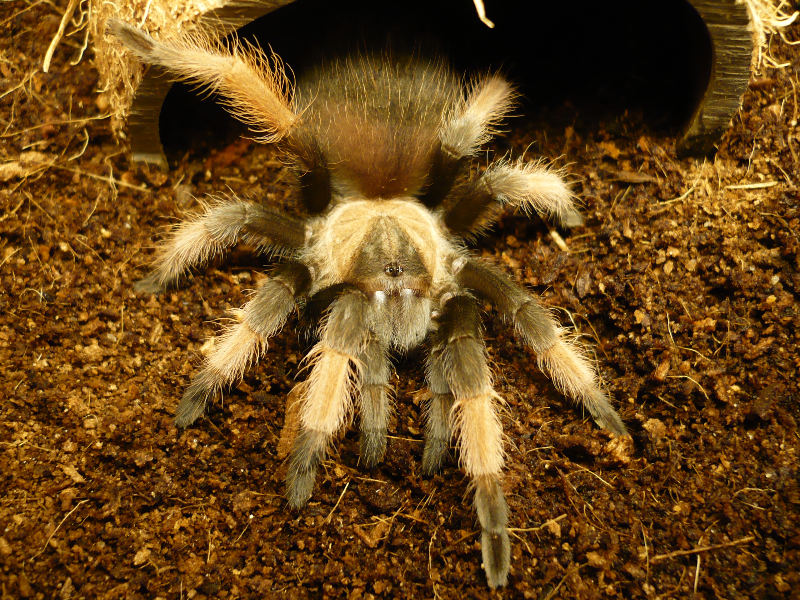 Zde je, chlapak (Theraphosa apophysis, 7.sv, samec). To je poprve, co pri otevreni vicka krabicky neskocil zbrkle do diry. Navnadil jsem ho predtim na svaba, ktery se mu zahrabal a sklipkan vyckaval.