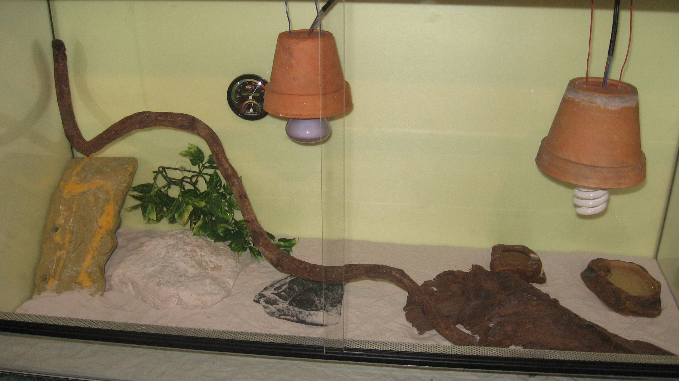Tady je to foto. Byl bych vám moc vděčný kdyby jste mi teda poradil jestli je to dobře a jestli je to dobře umístěné to uvb zatím jí to pomalu zařizujeme, takže to není nic moc. to žluté co tam vidíte je polystyren okolo terárka. je to totiž velice chladná zeď a ten polystyrén hodně udělá svého :)