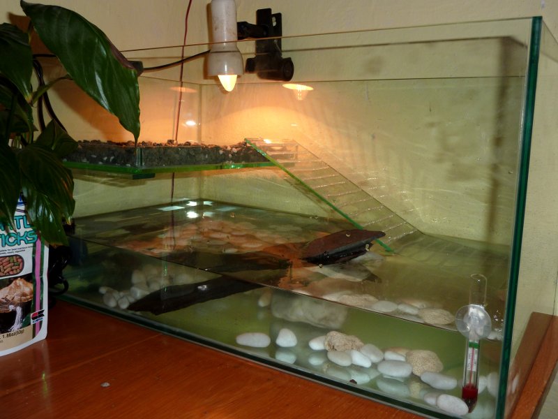 Čo sa týka zariadenia, nevidím filter ani ohrievač, aj keď tam vedú šnúry. Ak ho máš aj s termostatom, teplomer nie je potrebný, iba hrozí riziko jeho rozbitia. Ten koreň, čo trčí nad hladinou možno začne onedlho plesnivieť, mne sa to tak tiež kedysi stalo. Lepšie by bolo, keby bol celý ponorený vo vode. No a nakoniec by som zakryl zhora akvárko, aby korytnačka nedýchala vzduch chladnejší ako je teplota vody. Potom je riziko prechladnutia.
