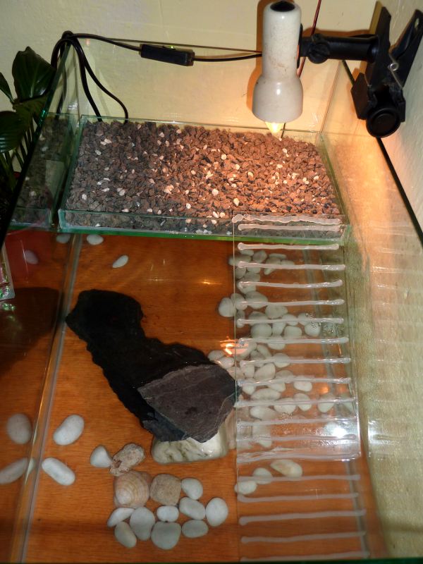 zatím jsme s vodou na 7 cm... postupně bych chtěla zvyšovat aspoň na 12 cm... ale až se naučí plavat... ma na dně teď několik oblázků, takže v těch místech je vody míň a má tam kámen na který si může vylézt... ale zatím se většinu času opírá nebo leze na topítko... ale doufám že si zvykne a začne plavat... na souš zatím vůbec nechodí... nevím jestli mám tu plošinu vysoko nebo je příkrá.. ale nevím co dělat aby tam začala chodit.. máme v plánu souš snížit.. aby tam začala chodit.. chtěla bych sem dát fotku.. ale nejde mi to.. pořád mi to píše nezadali jste typ souboru.. :o(