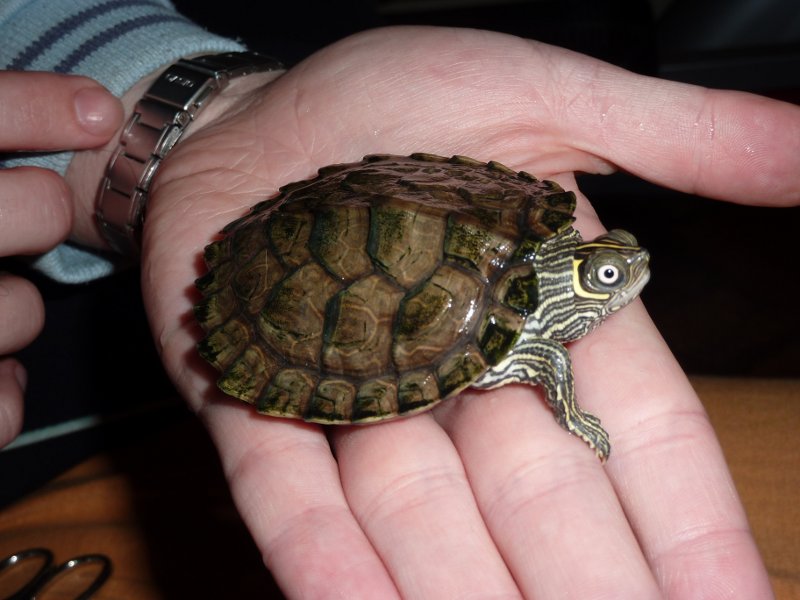 jedná se o želvu ozdobnou a je velká asi tak 5 cm... a prej je stará tak 1,5 až 2 roky... dostali jsme ji s akvárkem (podle mě velmi malým -30 x 20 x 20 cm) a kamenem, kde má souš... krmili ji granulemi pro želvy....