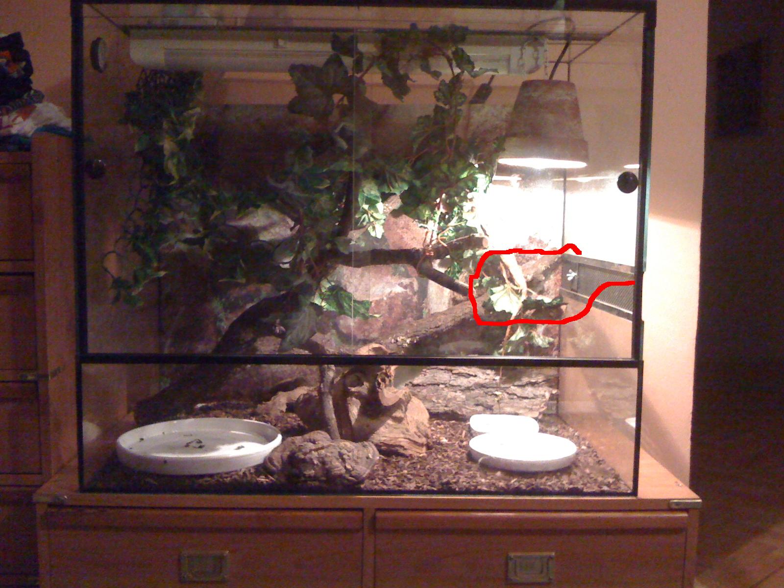 Lego 25 ma pravdu.Toto nie je vhodne terko pre leguana.Malo by byt určite vyššie.Takto leži dole pod tym obrovskym kvetinačom.Leguan sa rad vyhrieva hore vo vyške na konari alebo polici.Substrat vyhod-môže ti ho začat žrat a lepšie sa ti bude udržiavat čistota.Na policu aj pozadie sa vyprdni-zbytočne mu budeš uberat priestor.Kup tam aspon 2 uvb trubice Narvy,alebo Sera.Ten kvetinač vymen za menši a daj do toho menšiu žiarovku na ohrev. Konare inač rozlož až nemusiš dorabat policu.