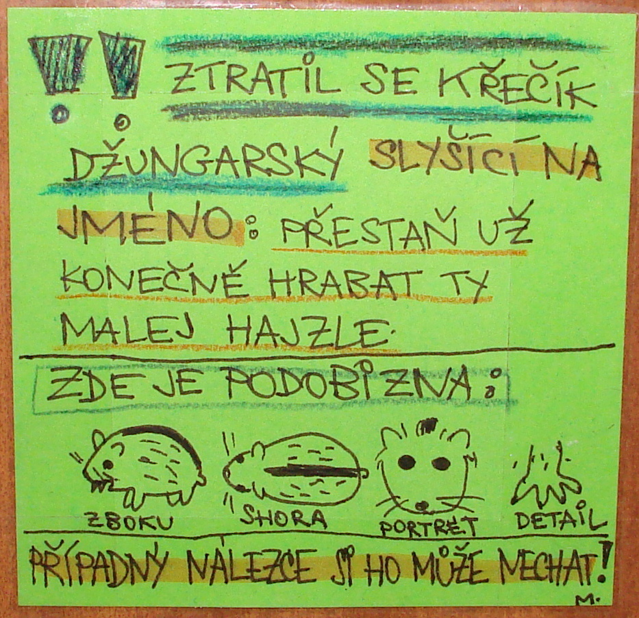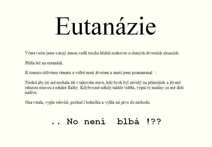 Arabská teroristická komanda oznámila, že žádný útok na ČR nechystají.Jejich analytická skupina totiž zjistila, že po likvidaci vlády, parlamentu a senátu by se naše životní úroveň zvedla na trojnásobek. . . . . . Lísteček za stěračem zaparkovaného auta:"Zpráva pro zloděje: Nádrž je prázdná, rádio nemám a motor je vylágrovaný."Druhý den přibude další lísteček: "Pro majitele auta: Takže kola jsou ti vlastně taky na hovno. . . . . . Manžel se šťourá v jídle a ptá se své ženy: "To je zase z plechovky?" "Ano, zlatíčko. Na plechovce byl tak roztomilý pejsek a navíc na ní stálo: Pro vašeho miláčka.