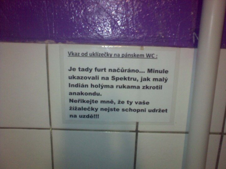 Chlápek v nóbl restauraci potřebuje na toaletu. Na pánech je obsazeno. Už to nemůže vydržet a tak nakoukne na dámy. Tam nikdo, tak hups tam. Libuje si, že jsou to krásné toalety a jak tak sedí,vidí tři knoflíky. Říká si pro sebe, že tohle na pánech nemají, co to asimuže být? Na prvním je "TV" - "že by televize?" Obrazovku nevidí. "Nevadí, zkusím to." Zmáčkne knoflík a teplá voda mu omyje přirození. "Hmmmm, skvělé, to musíme na pánech taky prosadit." Na druhém knoflíku je "HV" - "že by horká voda?" "Tak to vyzkouším." Zmáčkne a osuší ho horký vzduch. "Hmmmm, to si taky musíme pořídit, strašně si libuje. Na poslednim knoflíku je "AOT" - "co by to mohlo být?" "Tak to vyzkouším!!!" Zmáčkne knoflík a najednou se mu zatmí před očima a vzbudí se až na jednotce intenzivní péče,kde mu orosené čelo utírá sestřička a ptá se ho:"Pane, co jste prosím vás dělal?" "Byl jsem na dámském záchodě, byly tam tři knoflíky, tak jsem je zkoušel. A Vy jste zmáčkl i ten poslední?" ptá se zděšeně sestřička. "Pane, "AOT" je automatický odstraňovač tampónu, penis máte pod polštářem!"