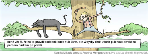 de zajíc lesem a krici: Prefikl jsem lvici! Potka vlka a vlk na to: Hele, zajici, zmlkni. Chces, aby to uslysellev? A krome toho ti stejne nikdo neuveri! Zajic bezi dal a krici: Prefikl jsem lvici! Prefikl jsem lvici! Potka medveda a medved: Zajici, zavri klapacku. Lev to uslysi, nasere se a problemy budeme mít vsichni! A krome toho ti stejne nikdo neuveri! A zajic jakoby nic: Prefikl jsem lvici! Prefikl jsem lvici! Prefikl jsem lvici!!! Nahle se objevil lev. Rozzureny na nejvyssi miru honi zajice. Honi ho a zajic nahle skocil do stareho vykotlaneho kmene. Lev za nim, ale nejak se tam zasekl. Zajic obchazi lva, blizi se k nemu odzadu, rozhlizi se kolem, rozepina poklopec a rika: - No, tak tohle uz mi opravdu nikdo neuveri...