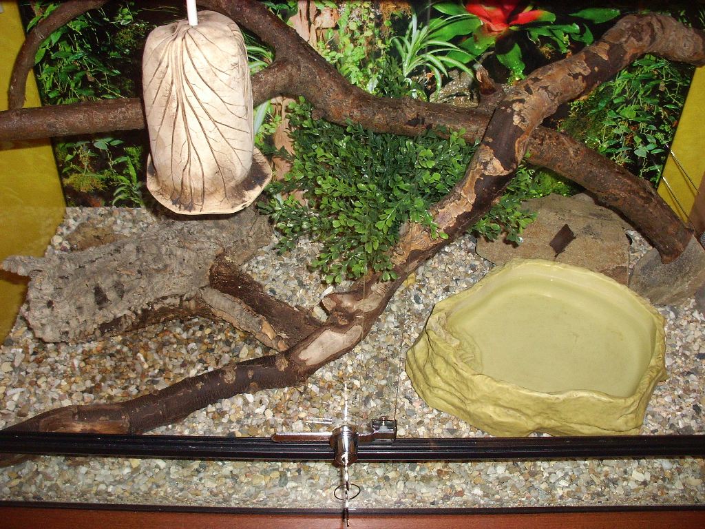 želva to má super, možná by ale ocenila nějaký úkryt... u užovek nejde vidět celé tera, jen jeho část ale vypadá pěkně... a hroznýš to taky nemá až zas tak zlé (i když opět nevidím celé tera), ale myslím že tam miska na vodu je pro něj malá, určitě by mu bodla větší aby se mohl celý namočit...
