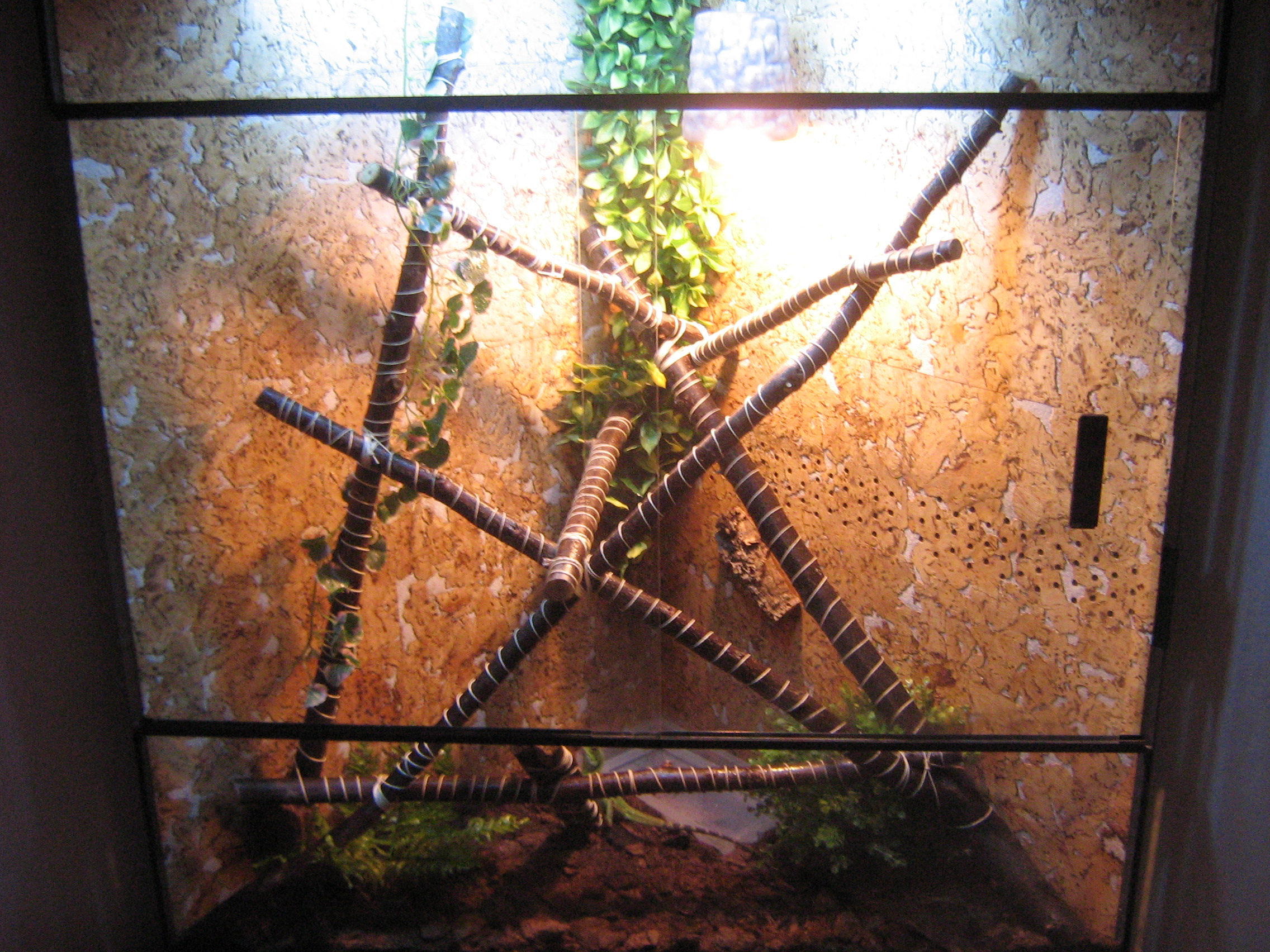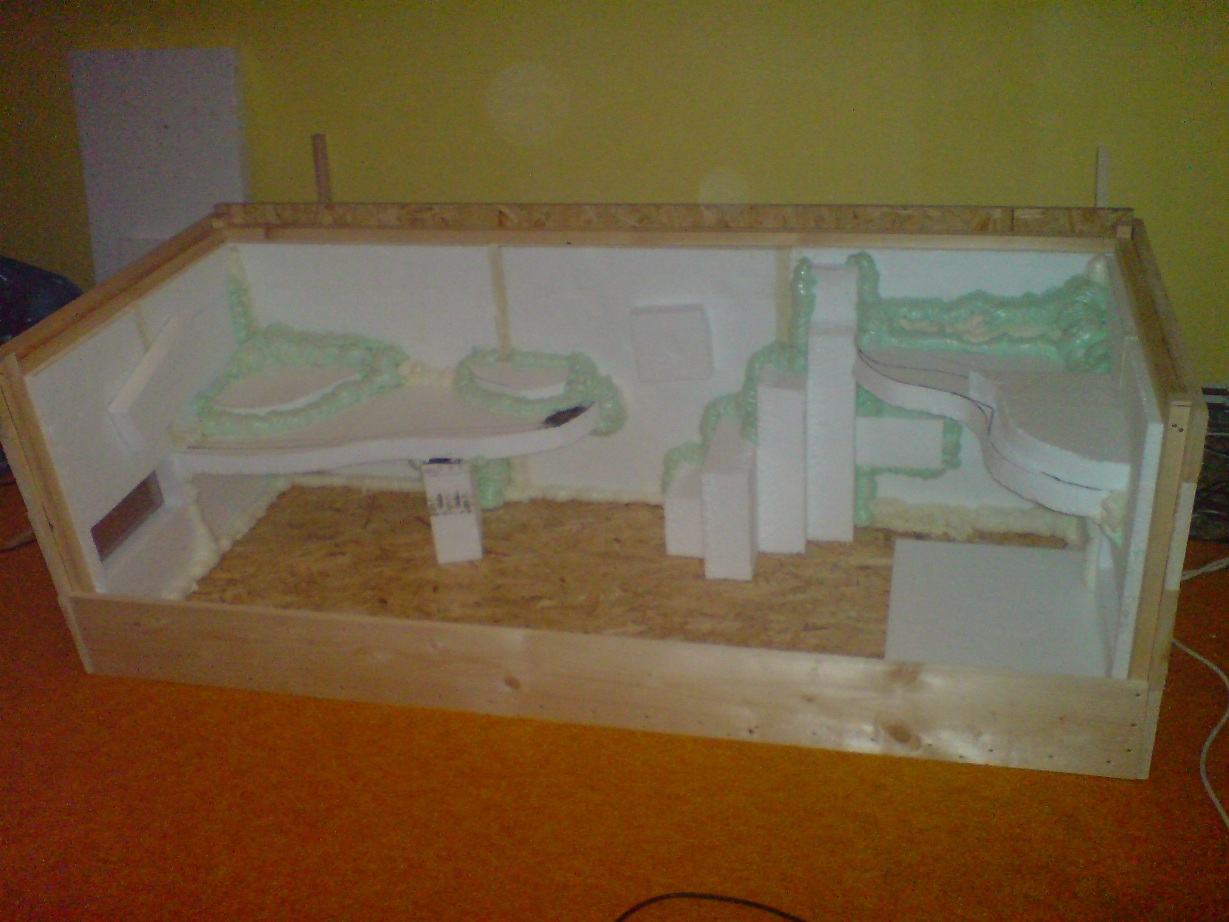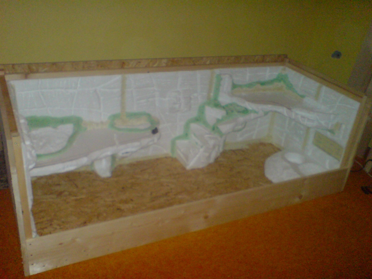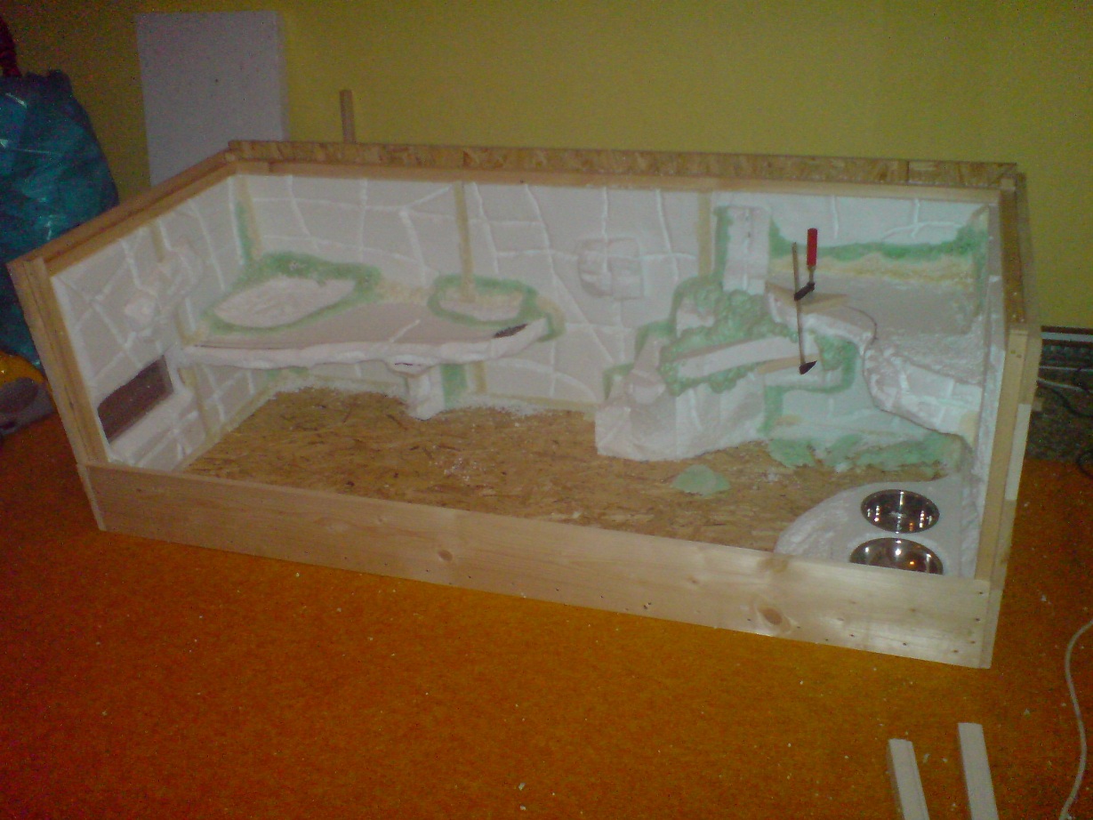 Tak to je mé první terko z lamina pozadí je z polystirenu a lepidla na obklady, na dno jsem udělal skleněnou vanu ,aby vlhký substrát nezničil lamino.Nahoru jsem udělal takový menší rack na odchovy. Myslím že na poprvé to jde ne?