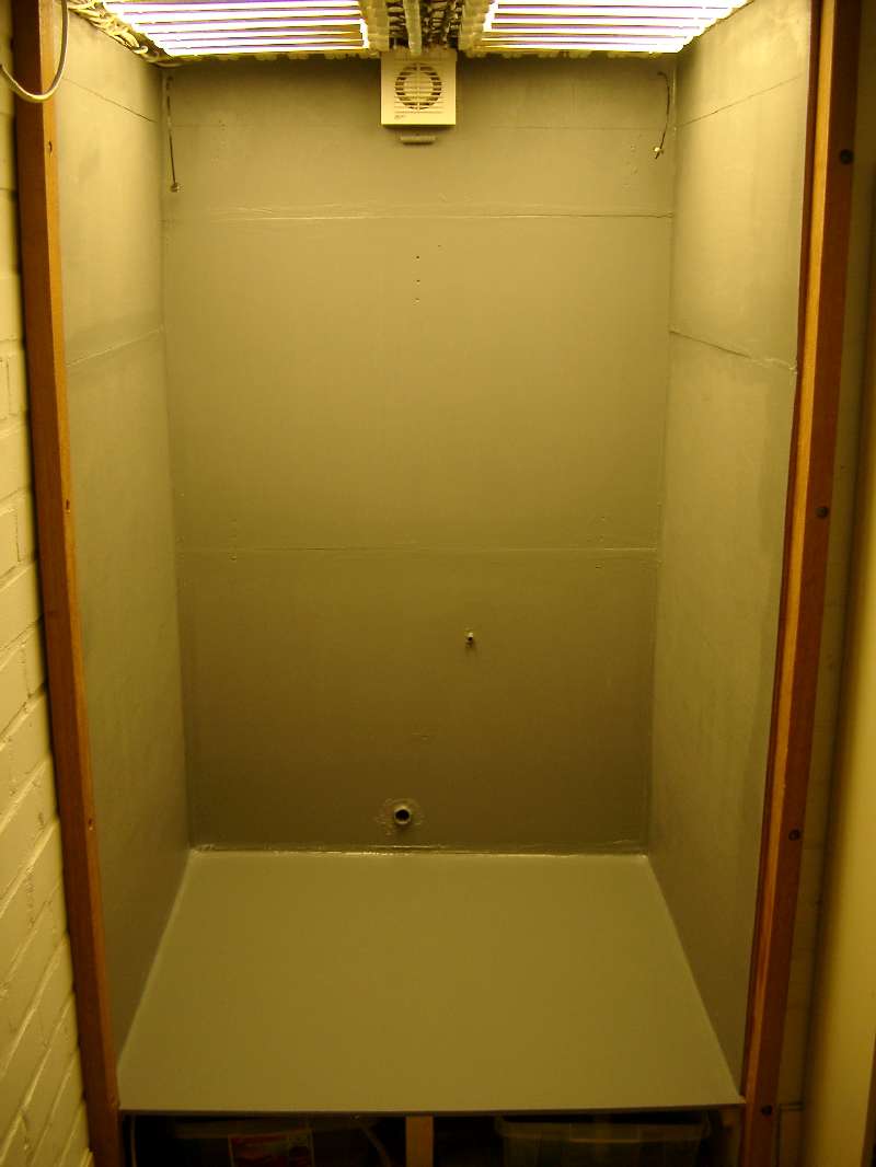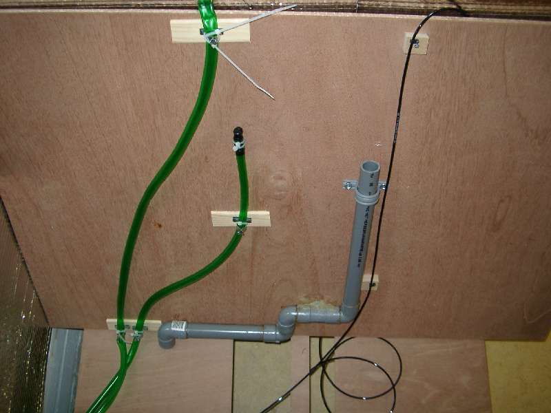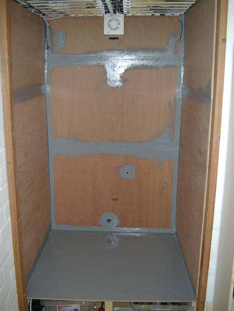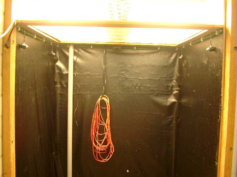 Když se podíváš na celkový pohled tak vidíš mezi terkem a horní skříňkou hnědý pruh, to je dutina 10cm tam je propojený větrání z dutiny a terka směrem za skříňku.Ta bodovka je ledka (ty se skoro nehřejou)1,2w svítí v ní 16 led diod a to větší světlo je obyčejná žárovka (zdroj tepla).V terku je vidět nahoře větrací mřížka. Dalo mě to docela fušku než jsem to domyslel až do konce.