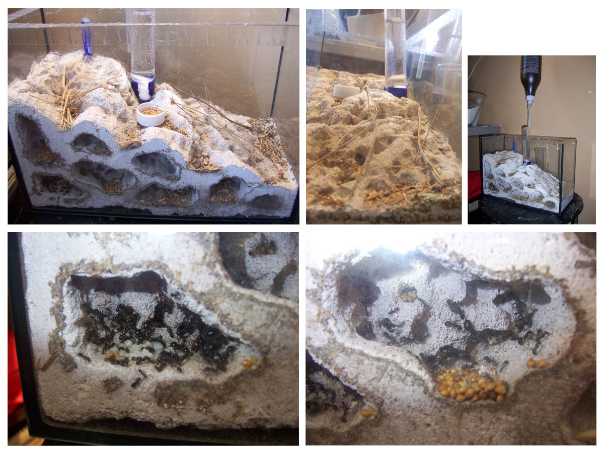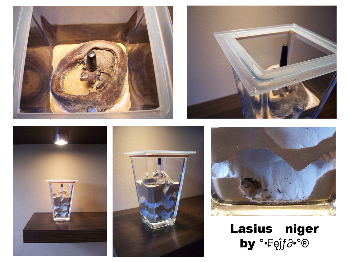 v tom vetsim formikariu je druh španelskyho mravence Messor Barbarus-zrnojed a v tom druhym je naš cesky mravenec obesny - Lasius niger, mravenec odchytnutej venku v Brne kousek od meho bydliste( jen tak si sedim na lavicve s kamosem a hele asi 2 kralovny se prochazeli primo podemnou tak sem neodolal a dneska ma asi 150 delnic).Chov mravencu je opravdu zabavnej konicek, prirovnavam to jako: ribicky v akvariu jenže bez vody