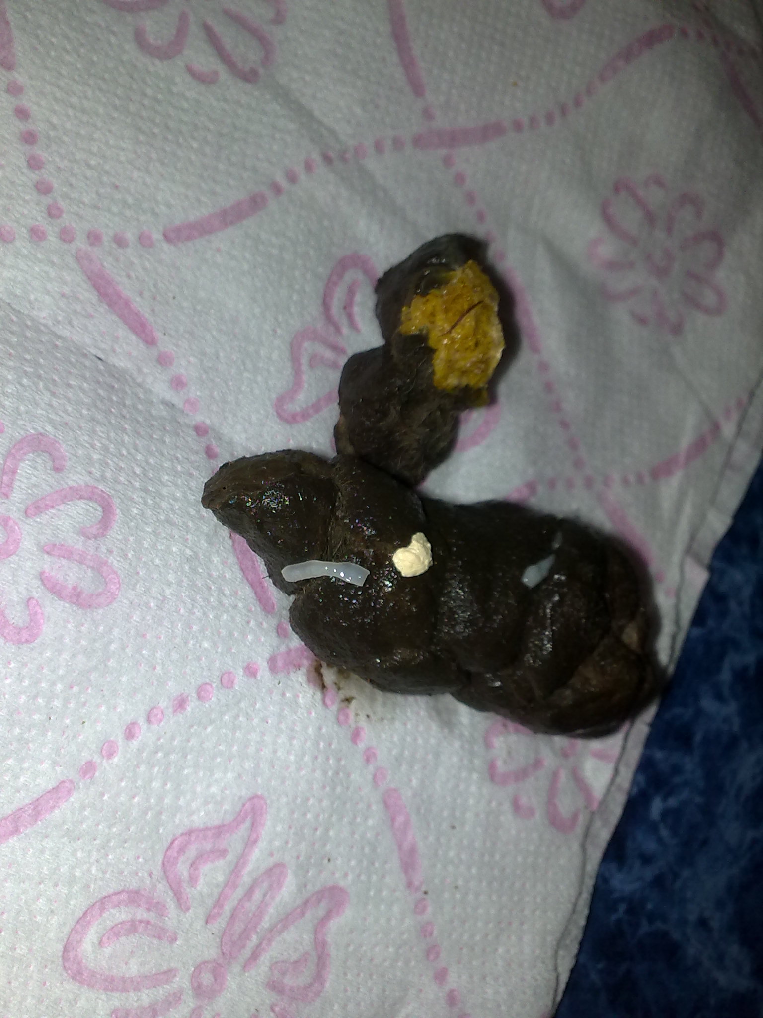 mam zhruba 1,5 roku starou krajtu kralovskou (ball python), dostal jsem ji zhruba pred pul rokem. Krajta byla drive kousava, ale u me se zklidnila. Asi pred tydnem zacala "knucet" jako pes, i kdyz nema duvod se neceho bat. Take jsem ted nasel v trusu pravdepodobne cervy - prilozena fotografie.