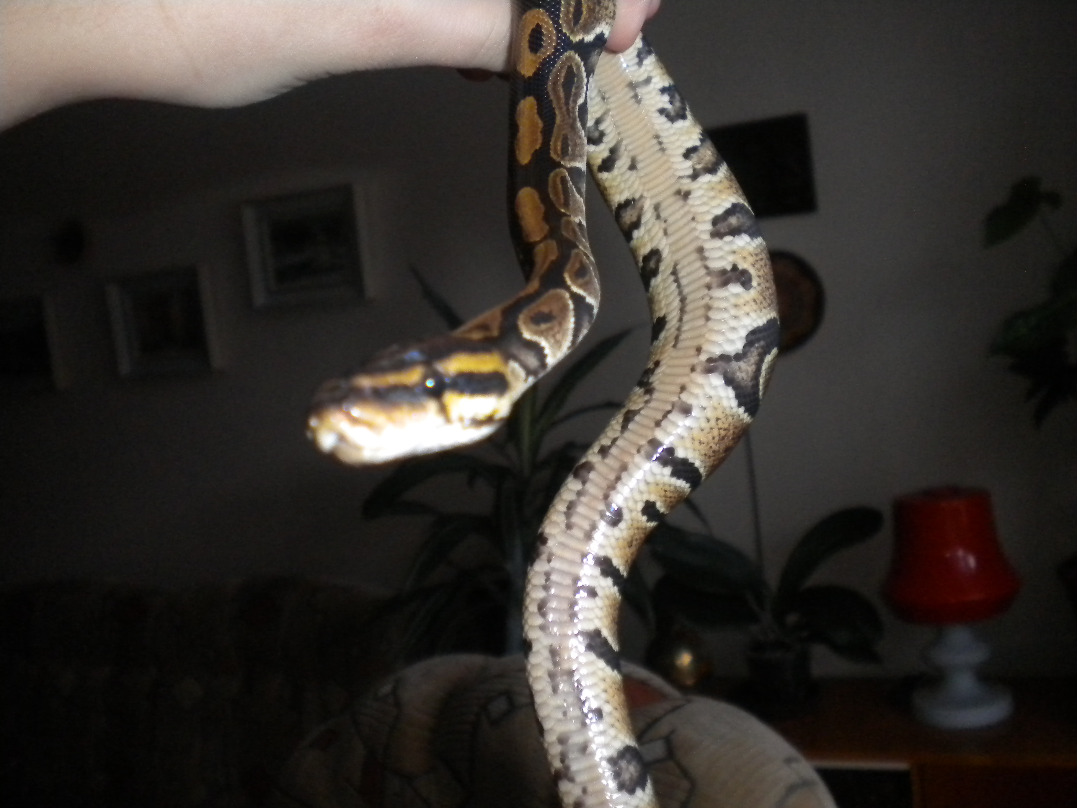 Včera jsem si přivezla pěti měsíčního,53 cm dlouhého samečka p.regius.Je klidný,vypadá zdravě,přesto jsem si všimla,že na první třetině těla má břišní šupiny bílé a za zbylých dvou třetinách nažloutlé s hnědými okraji.