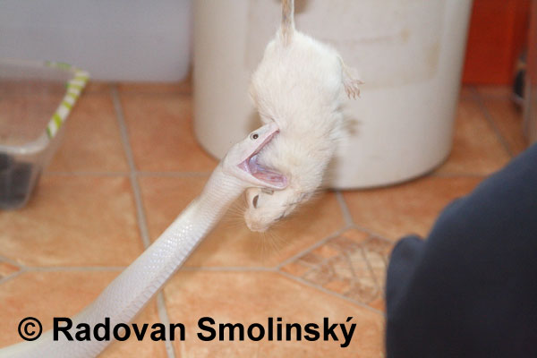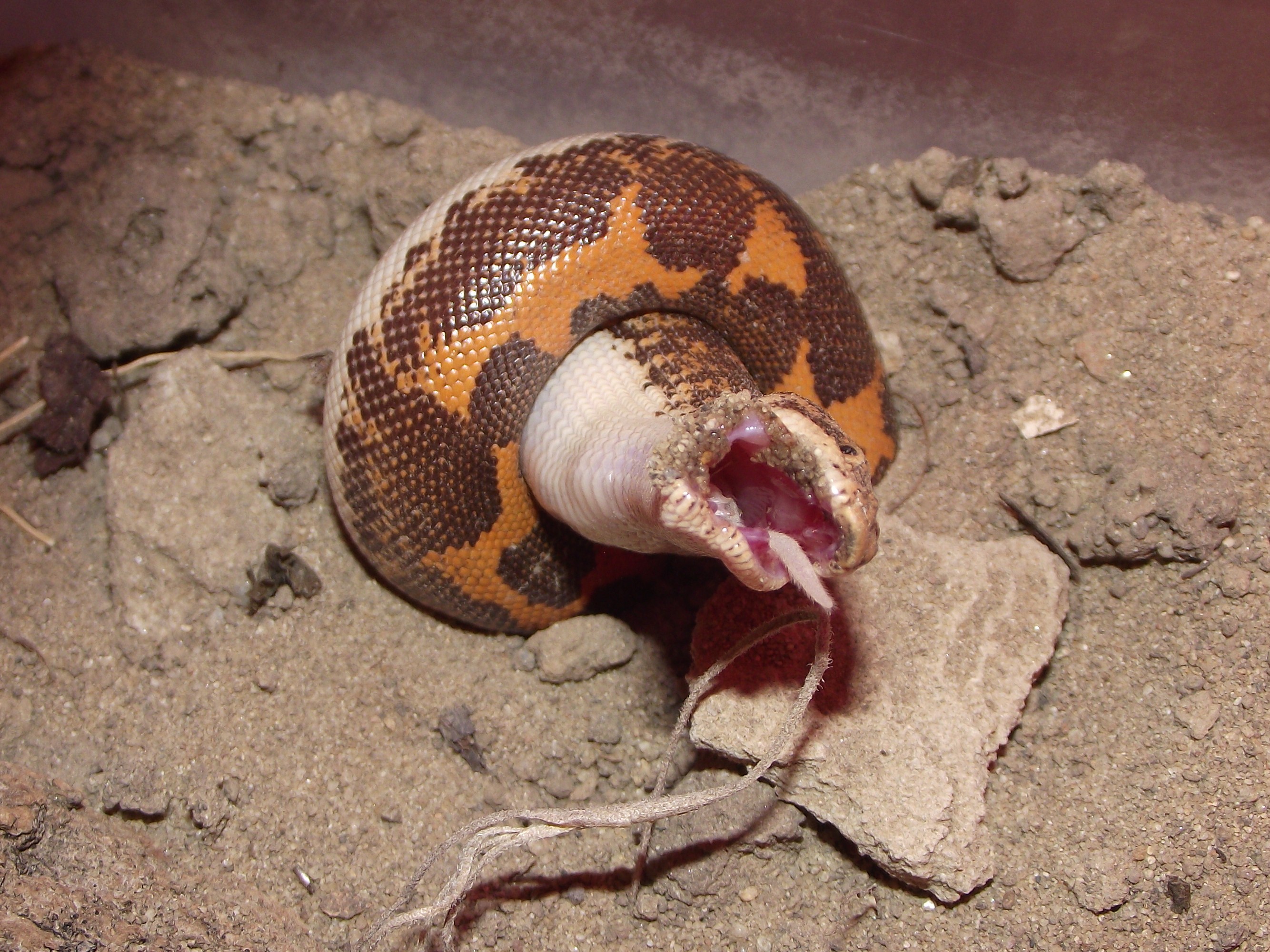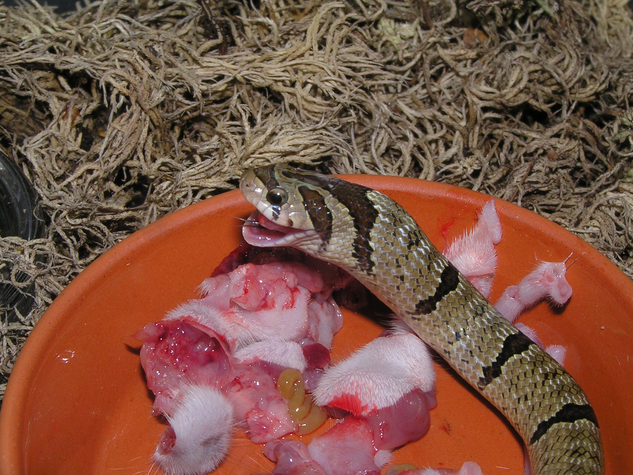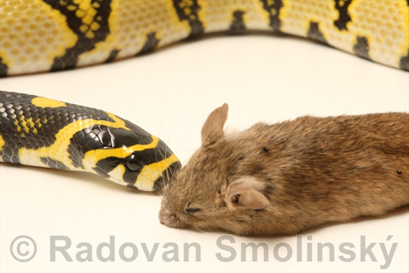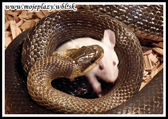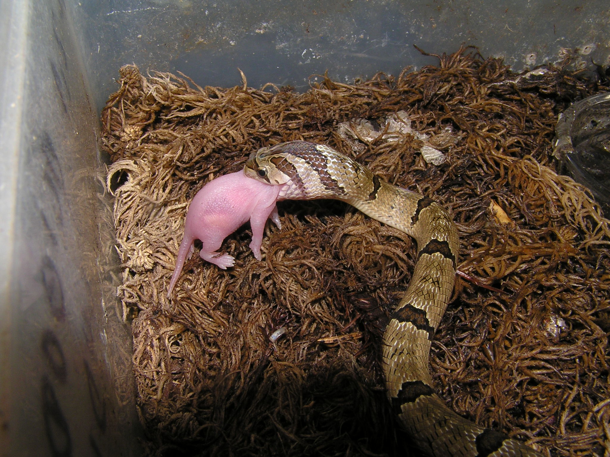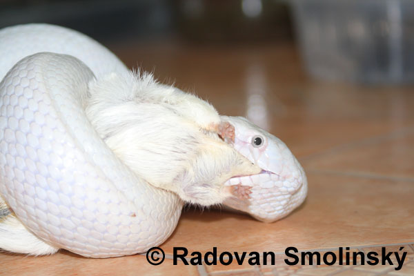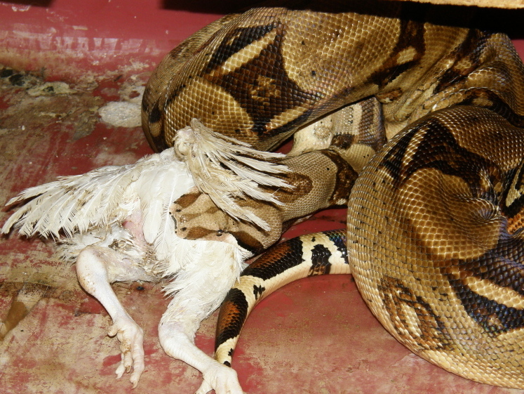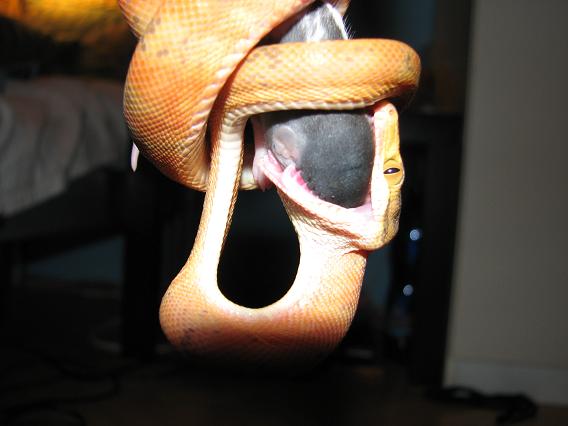 To, že je to proti zákonné, jsem nevěděl, ale prostě jsem to sem dal. Je to kořist jako každá jiná a třeba se i pár chovatelů inspiruje a raději hodí kotě, štěně atd. hadovi, než aby s ním hodil o zem, případně utopil. Ale žijem v ČR, tak jsem zvědav, kdy mě někdo bonze.
